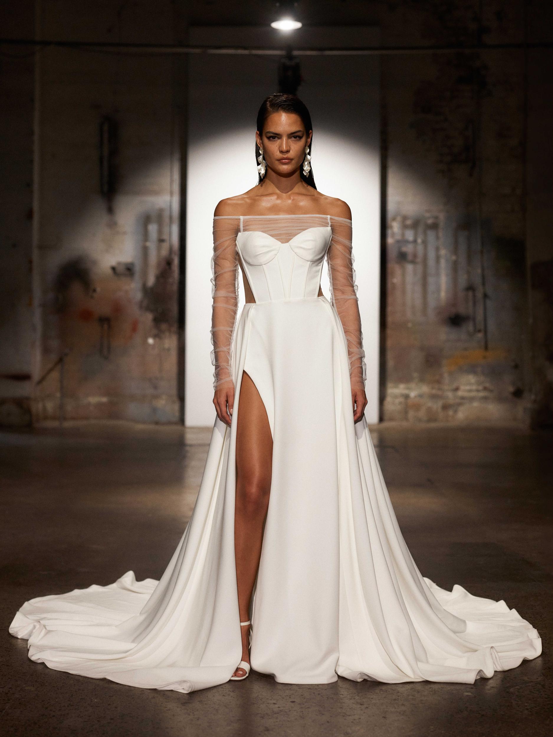Cool girl meets wedding belle in our ARI wedding gown in beautiful light ivory crepe from Evie Young.