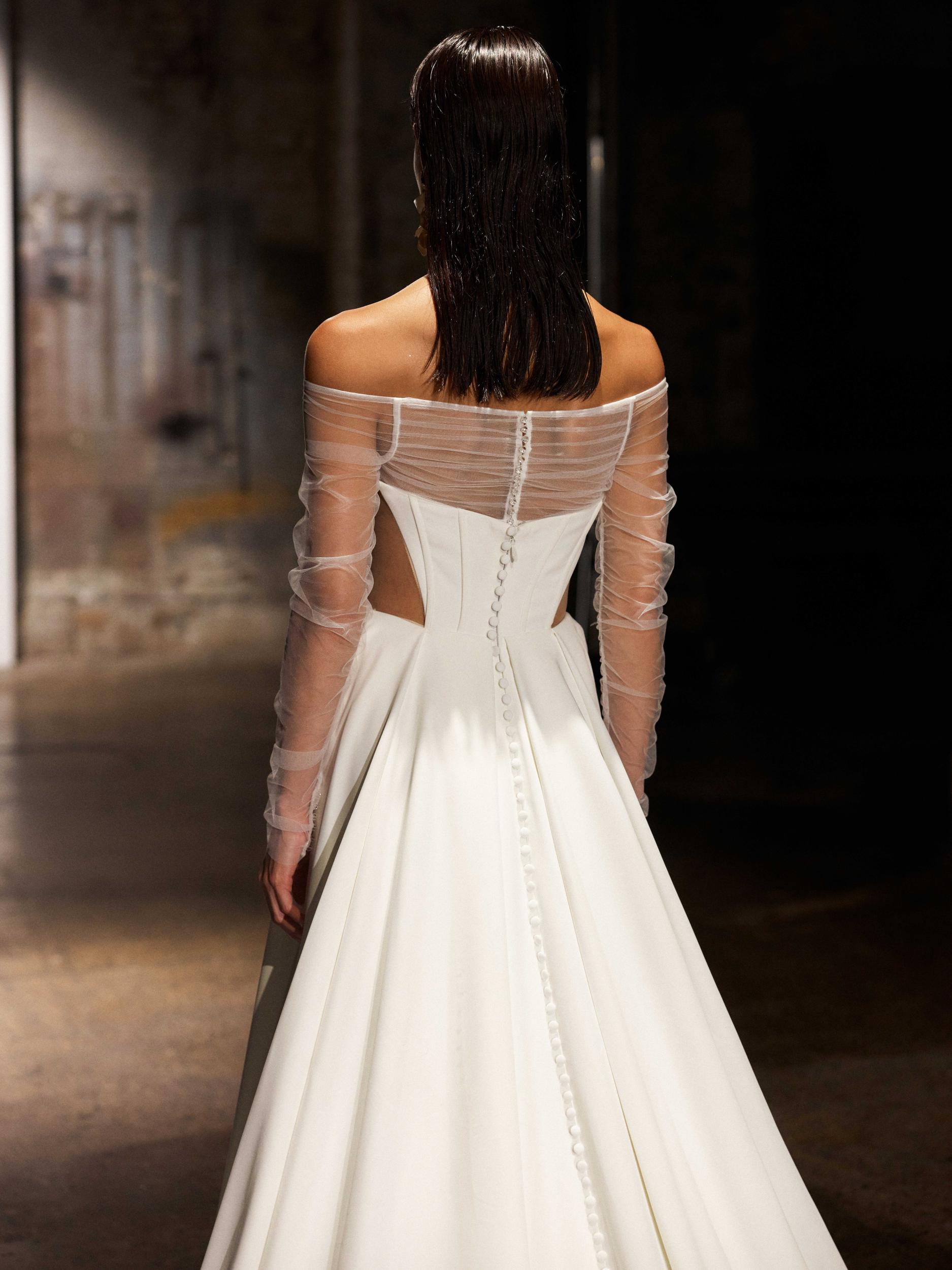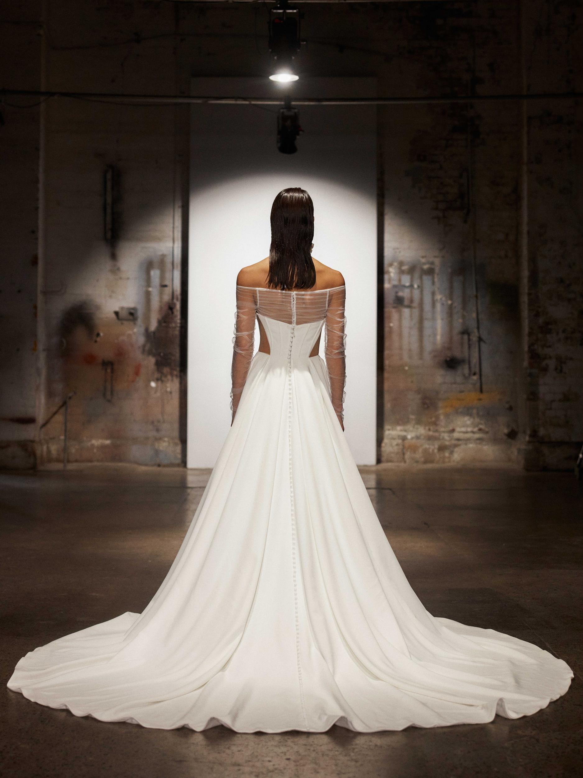 To finish the look, centre-back satin covered buttons line down the skirt reaching through to her hem.