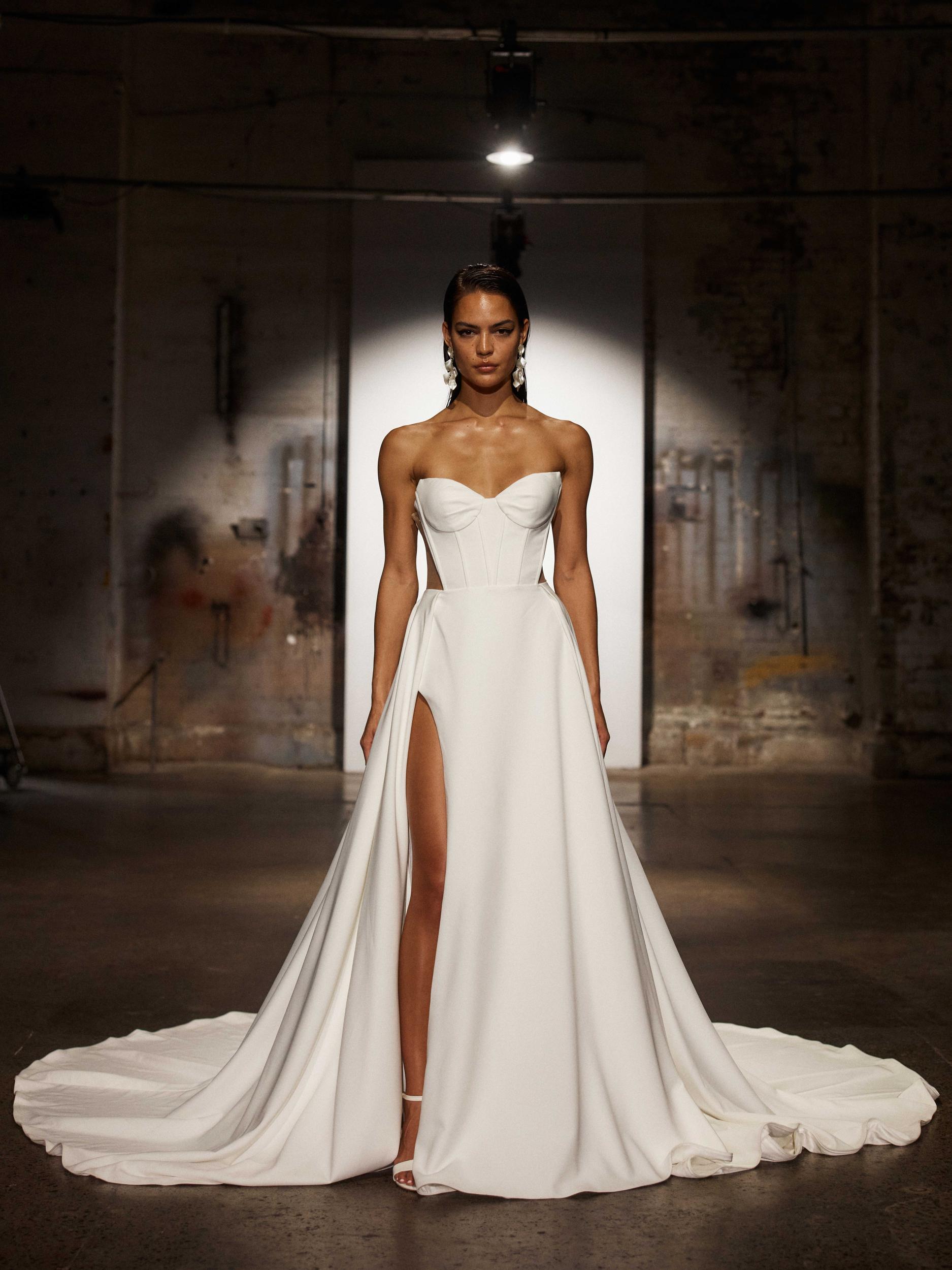 She has a clean princess vibe with a modern twist, taking the traditional strapless A-line gown and elevating it with architectural shape and texture.