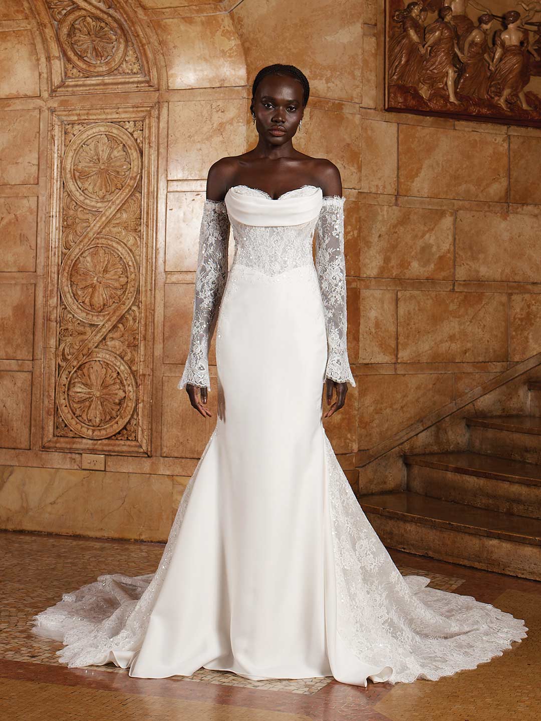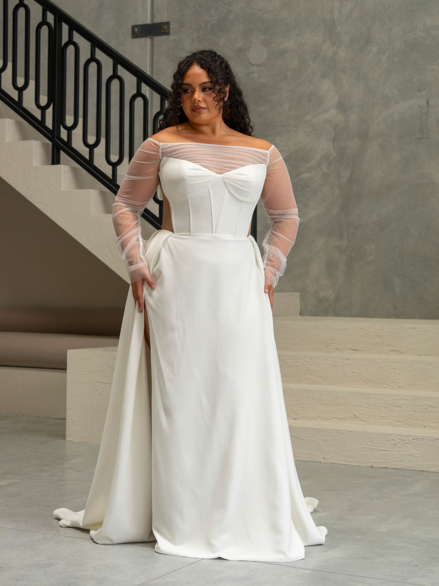 It’s all in the details hitting maximalist trends of our Hepburn wedding dress with fashion draping and slouched longer length detachable sleeves for a statement entrance. Shown here in matte ivory Chantilly lace which only has one layer of lining (Mocha) for a more sheer look, and also available in delustered Satin for a cleaner look.