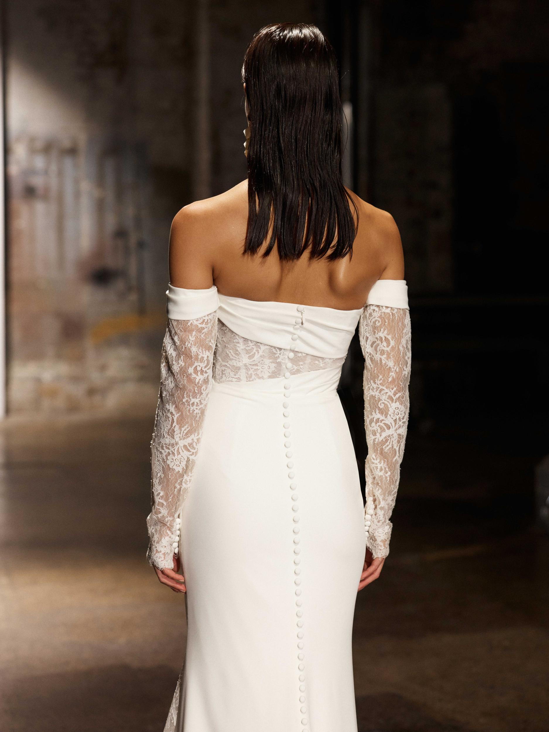 Elevating for a second look, are WINTOUR’S matching fitted Chantilly lace long sleeves with delicate eyelash hems, which also offer coverage.