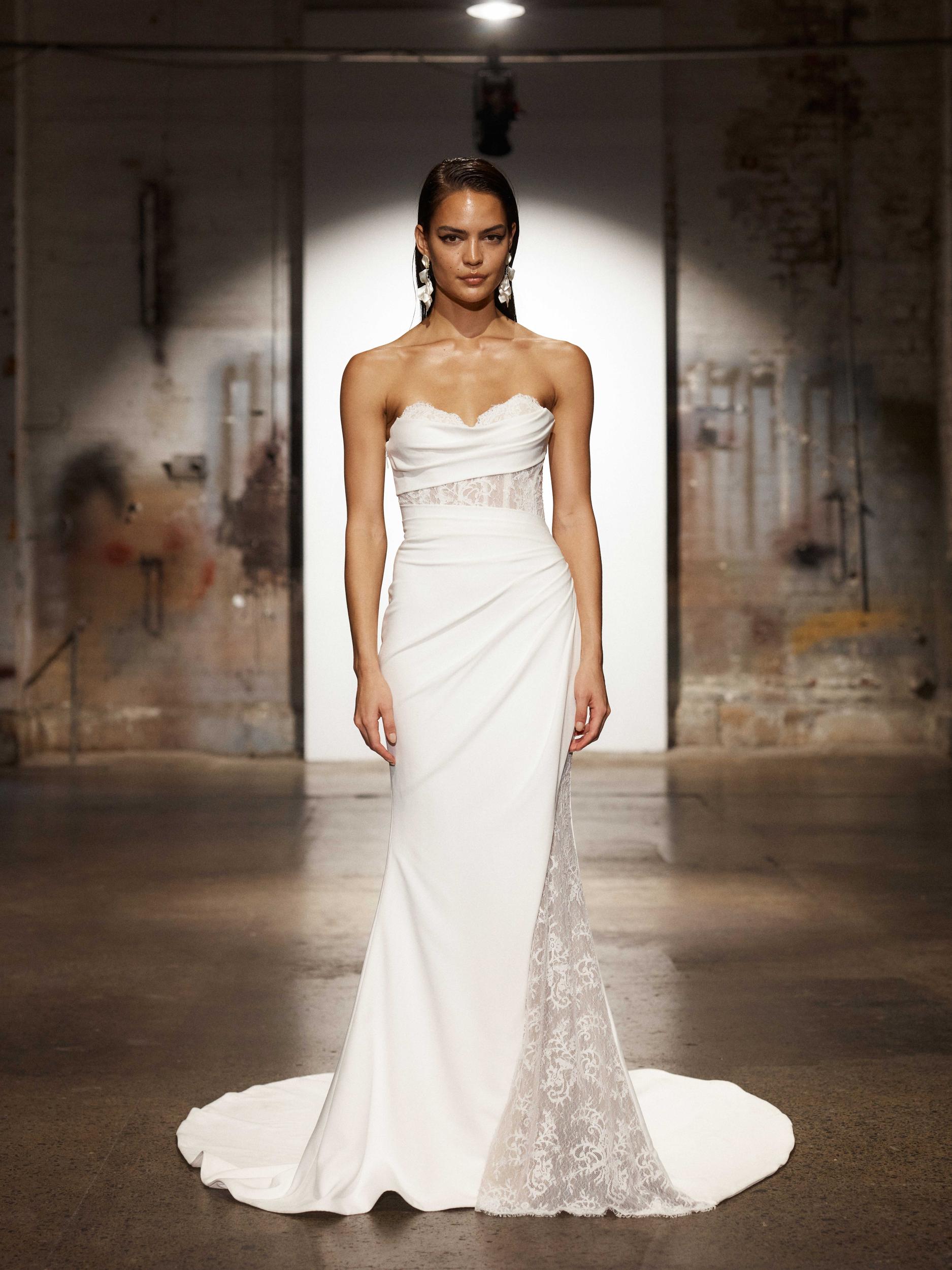 Our strapless Gray wedding dress is all about contemporary cool for our sleek fashion forward bride, which combines clean design on the popular fit and flare silhouette with a lace twist.