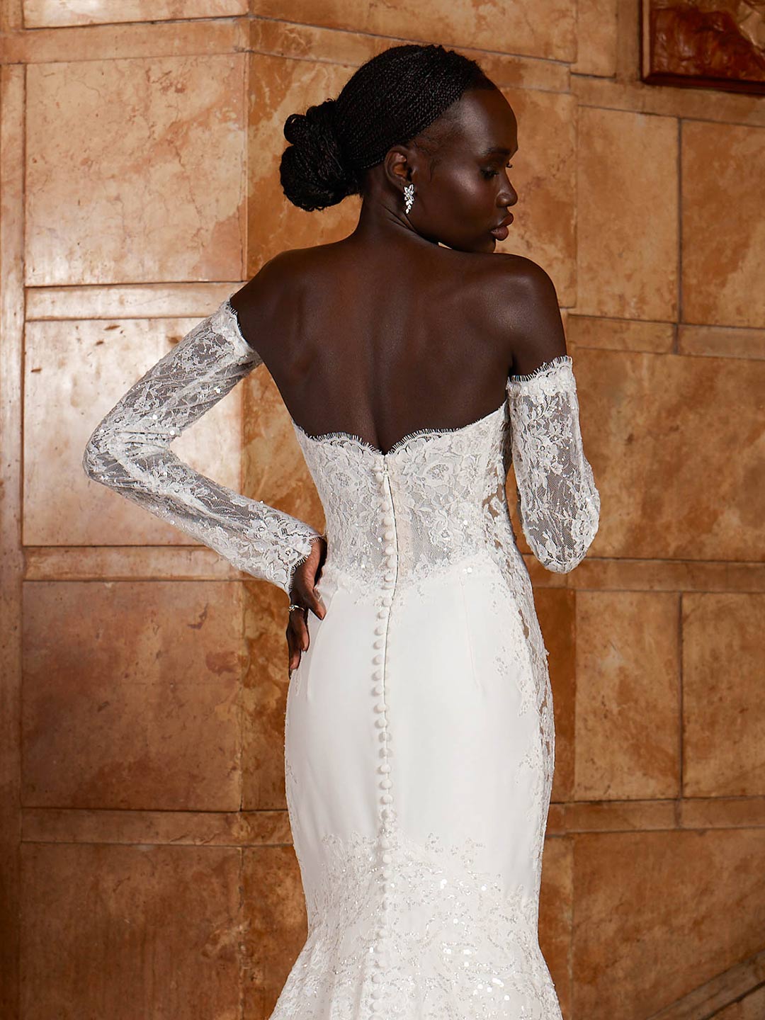 Moving through her mirrored back we see buttons that continue down the bodice through her skirt and train.
