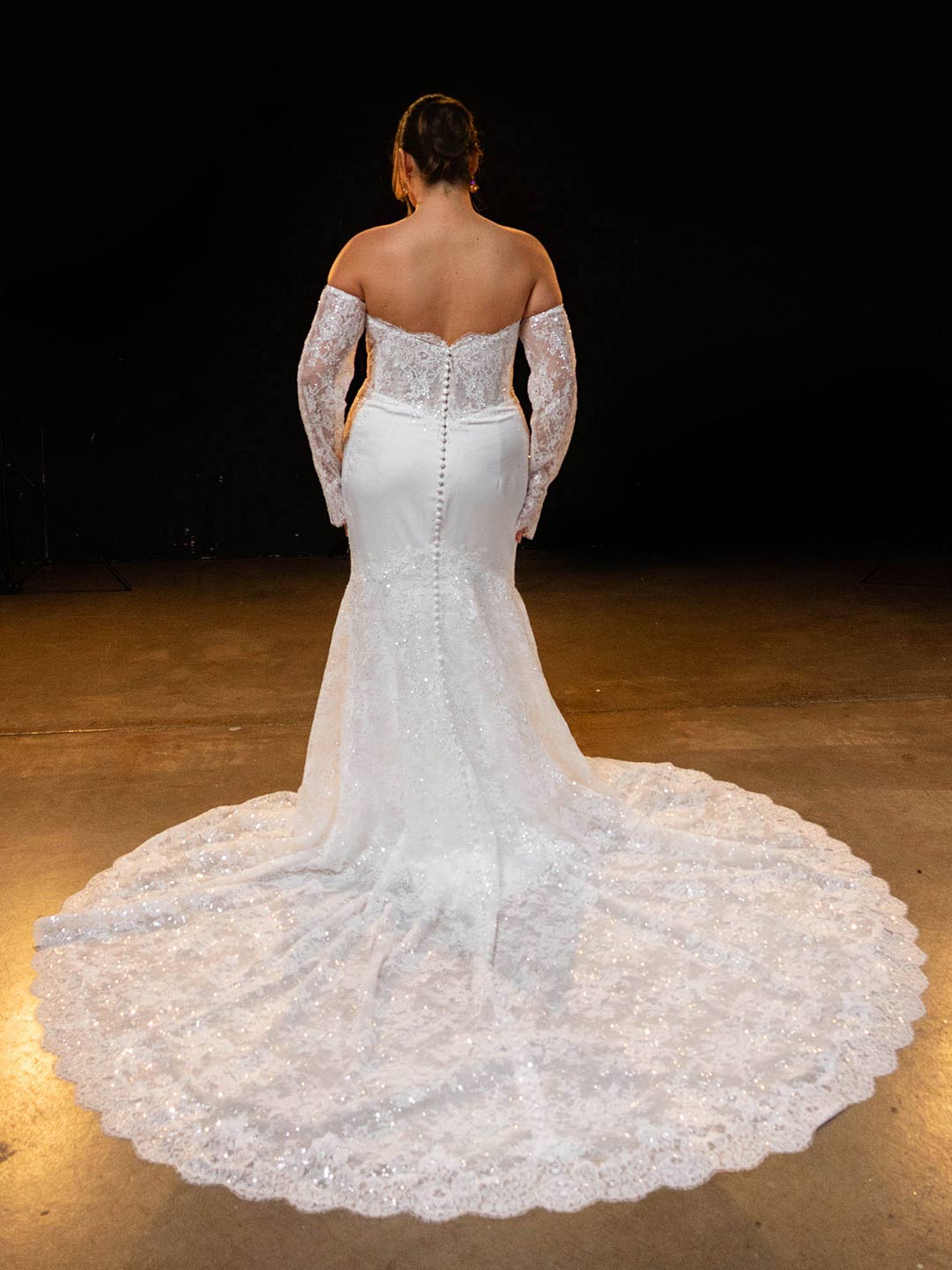 Behind is clean stretch satin, followed by a mermaid skirt of more Chantilly lace catching all the lights, which fans out in the back creating romance and drama as the bride takes her walk.