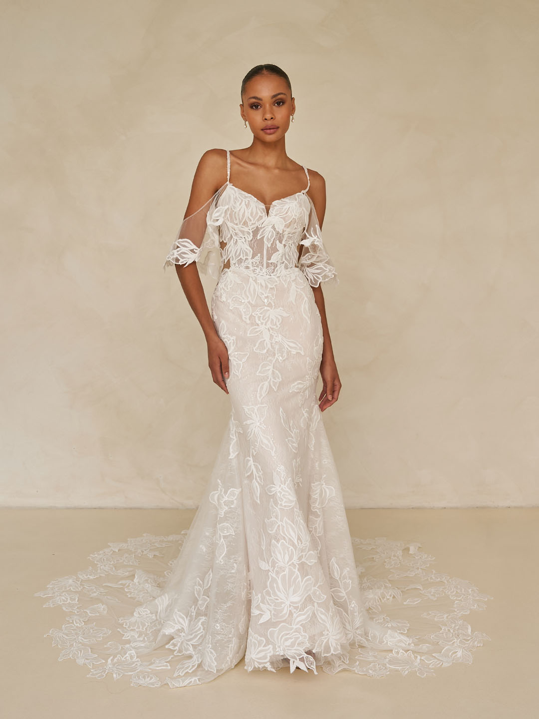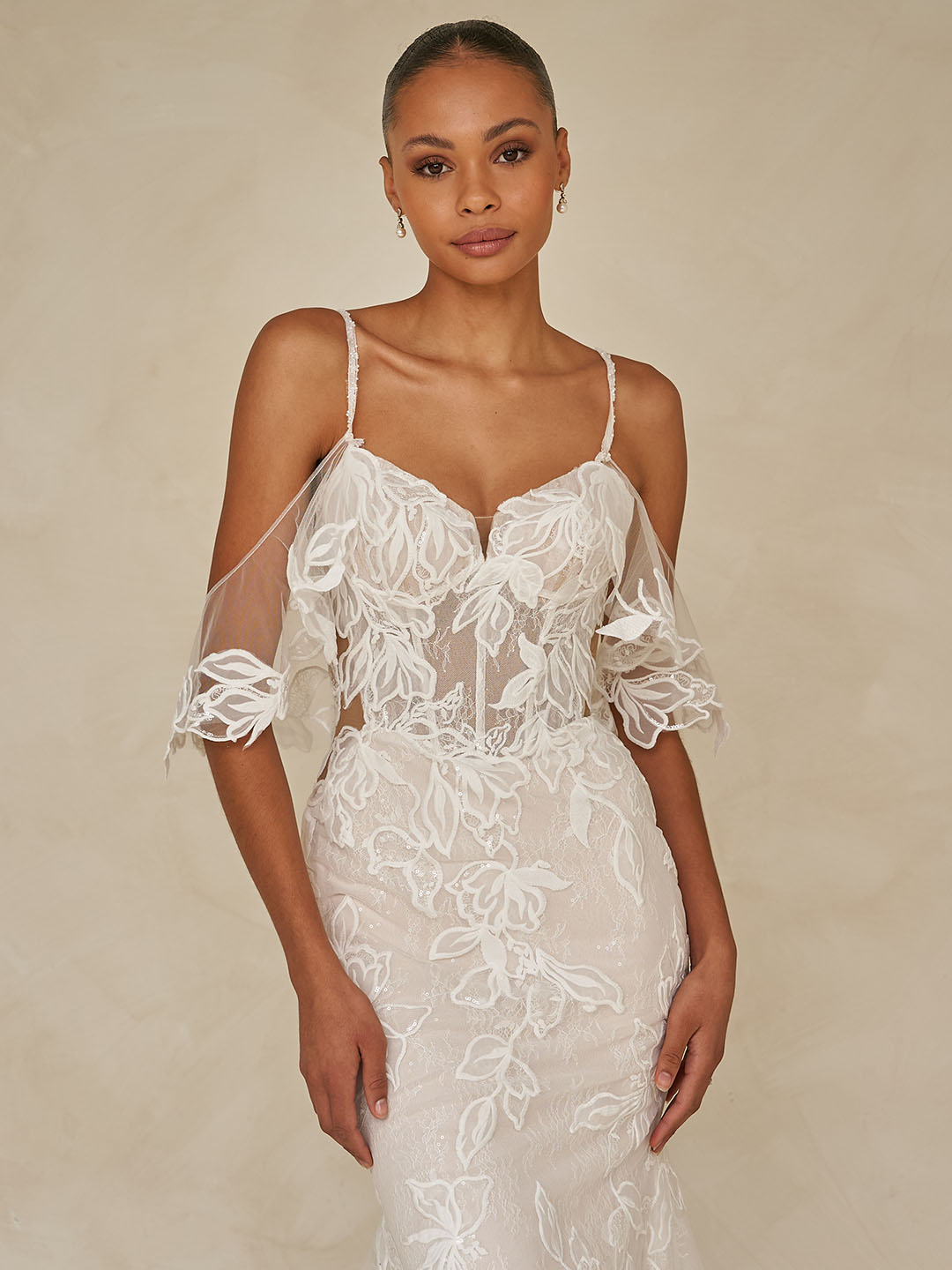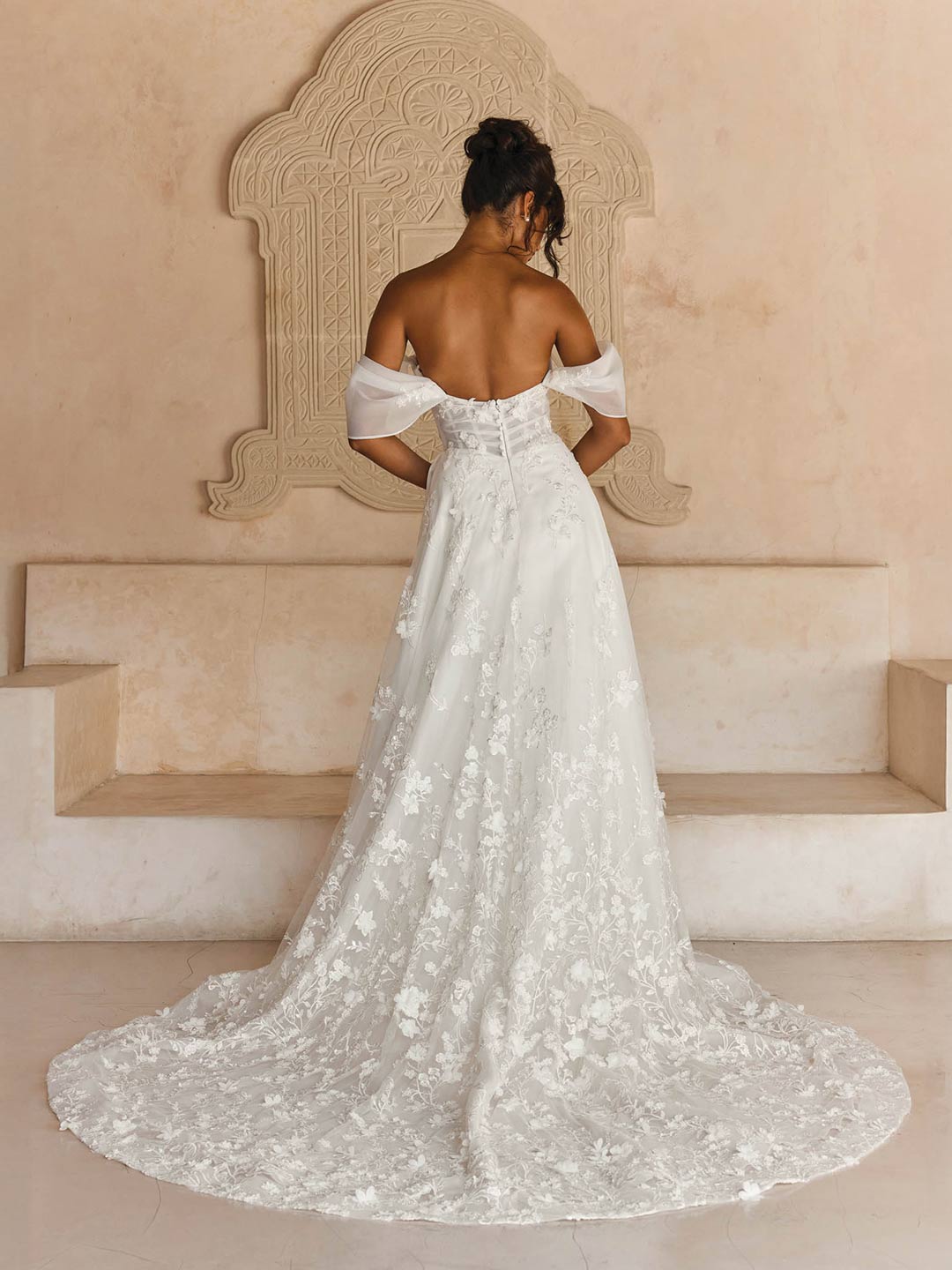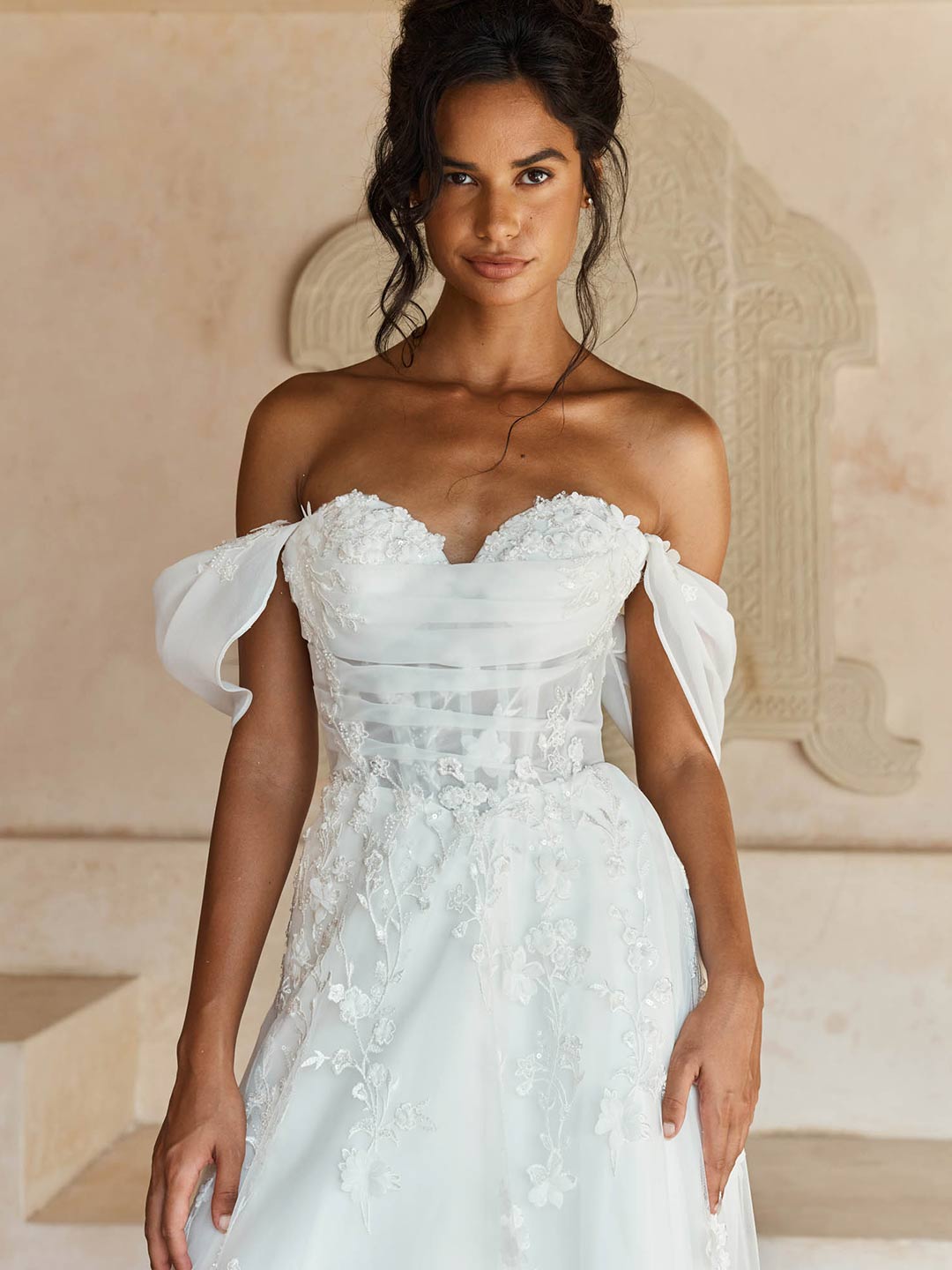 Lailyn is a romantic floral A-line wedding dress crafted from embroidered sequin beaded lace with cascading florals. A modern sweetheart bodice creates a soft illusion effect, paired with detachable off-the-shoulder straps for two looks in one. The asymmetrical pleated organza bodice and soft Basque waistline enhance the figure, and the A-line skirt features a left leg split for lightness and flowing floral lace that trails into a dreamy illusion train.