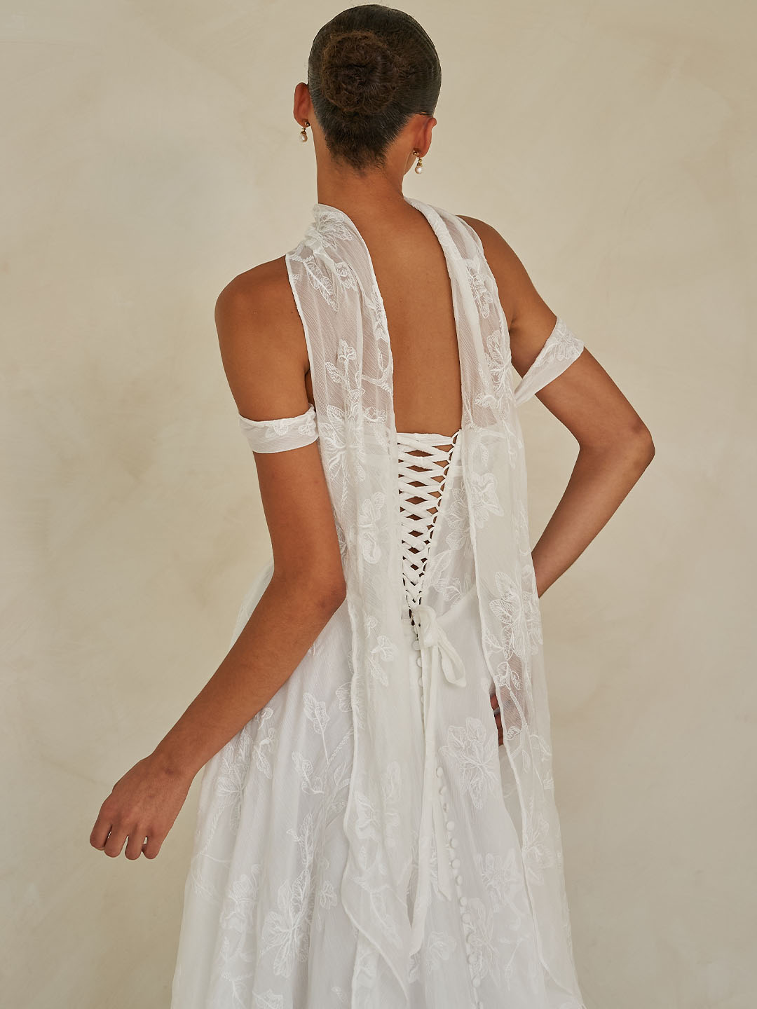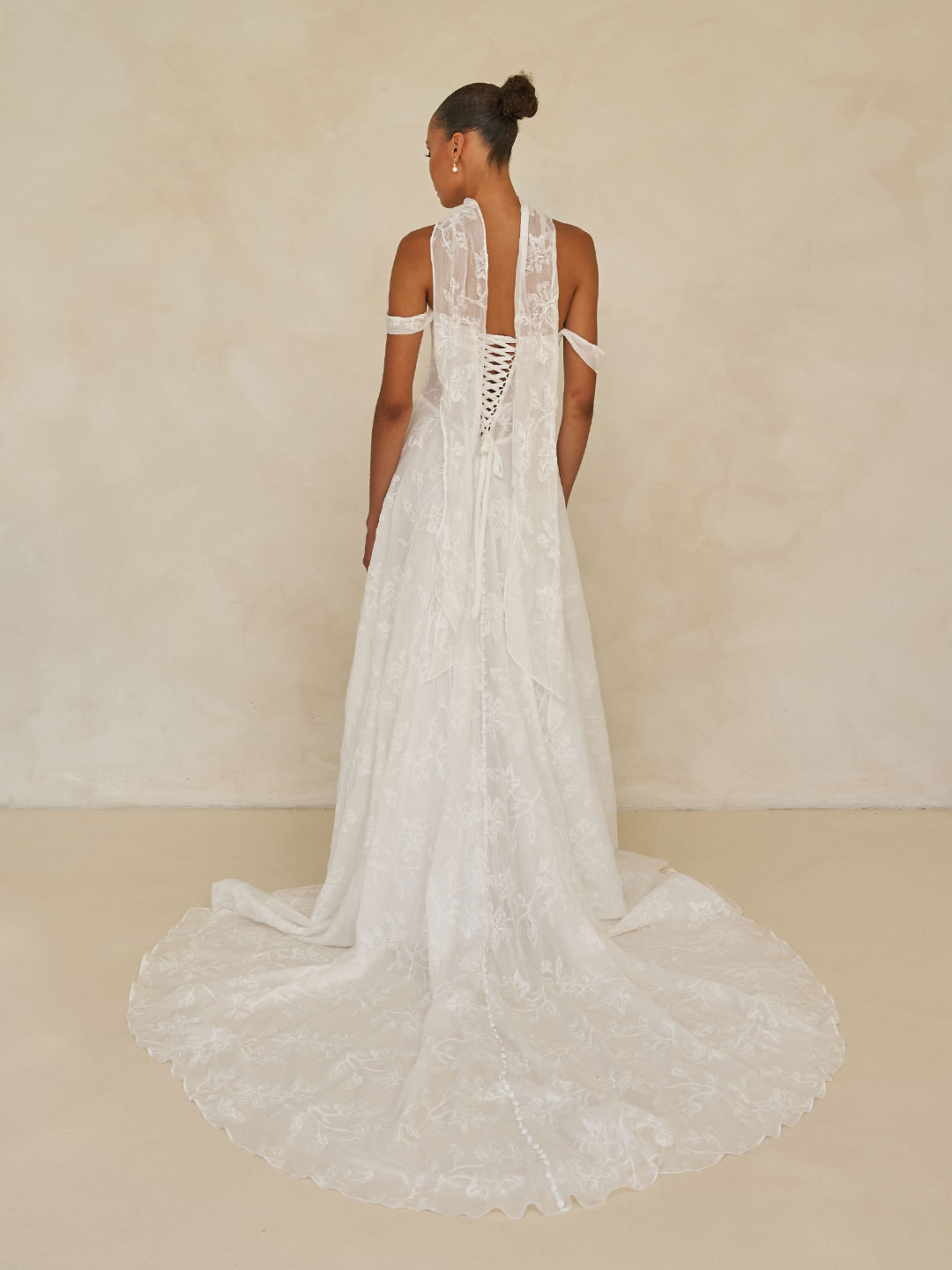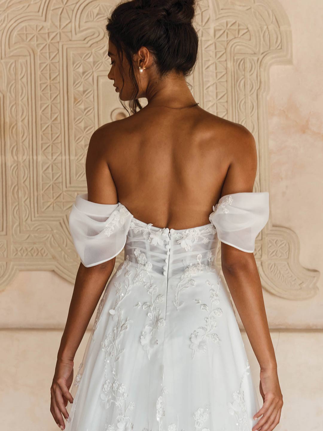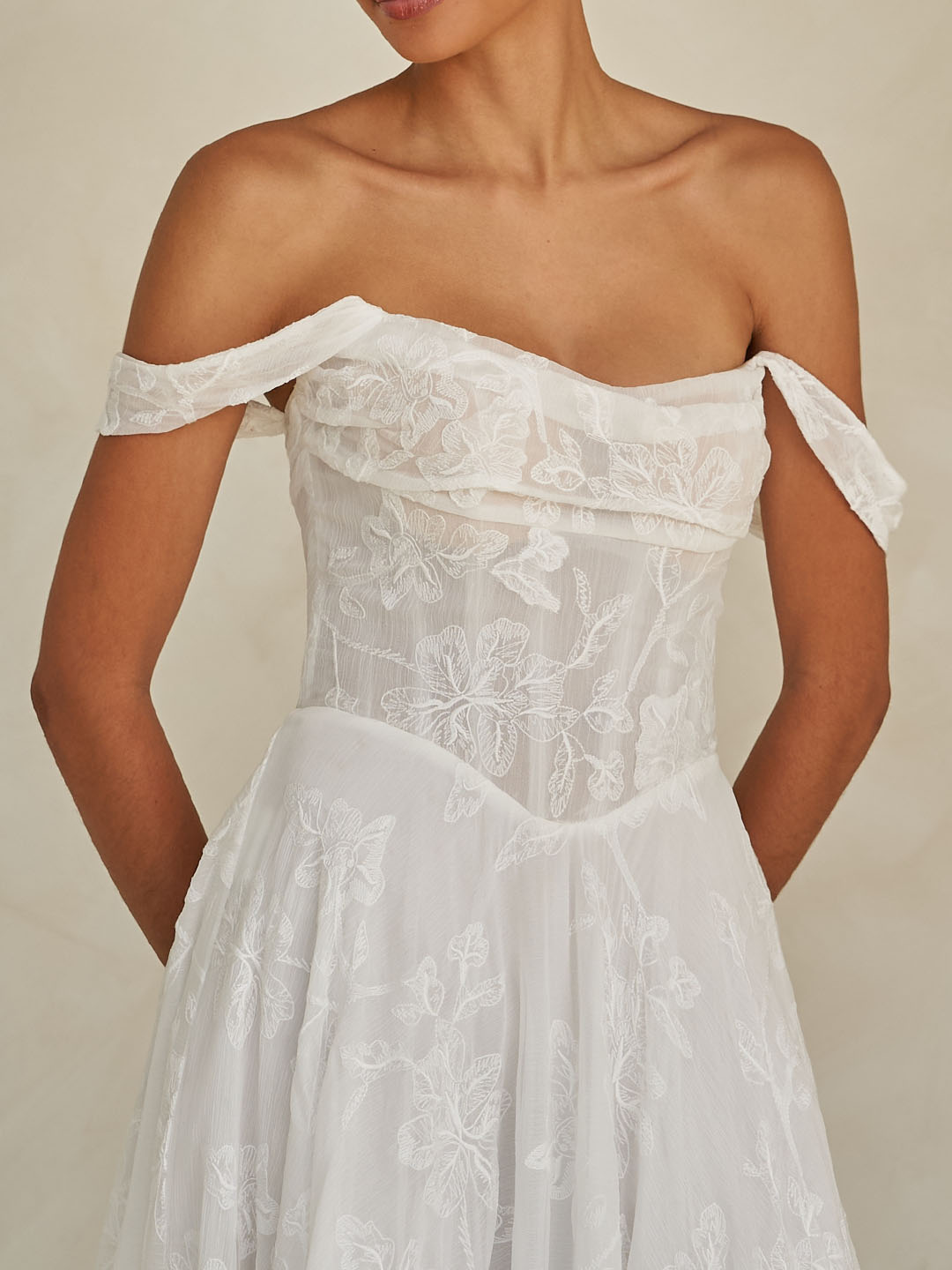 The Wilder wedding gown blends timeless romance with modern elegance. Crafted in unique, airy printed chiffon layered with embroidered floral motifs, it features an off-the-shoulder scoop neckline, artful bust draping, and a sculpting Basque waistline flowing into a soft skirt. A sheer bodice, detachable sleeves for a strapless option, and a romantic corset lace-up back add versatility and allure. A matching neck scarf completes this refined, modern-romantic bridal look.