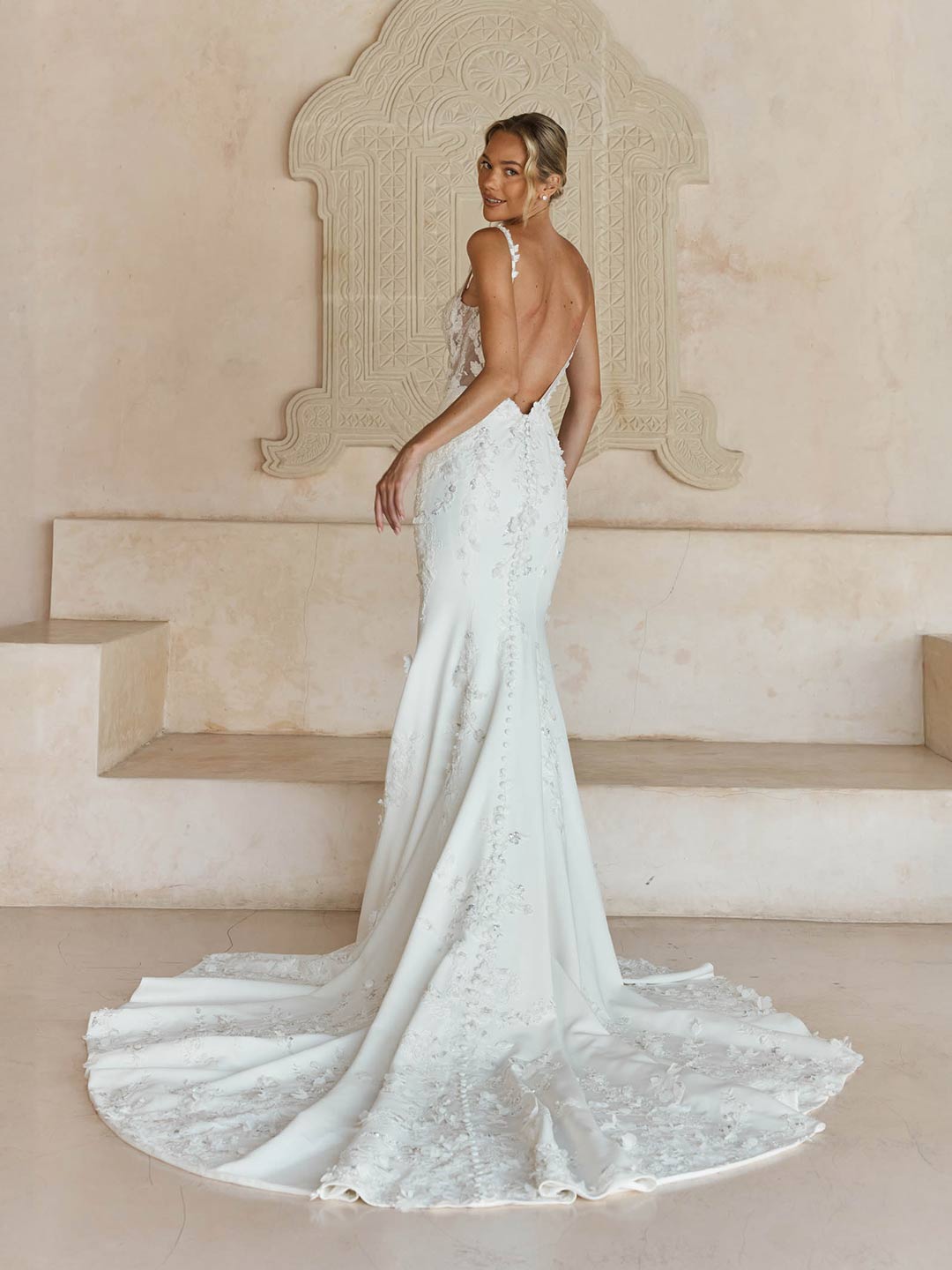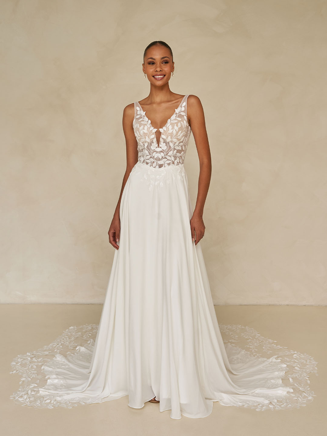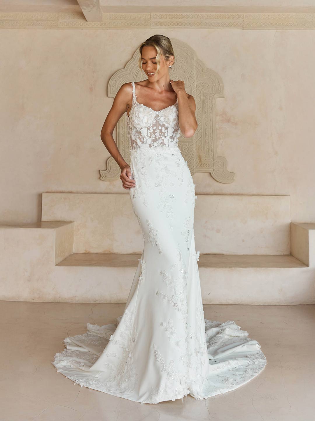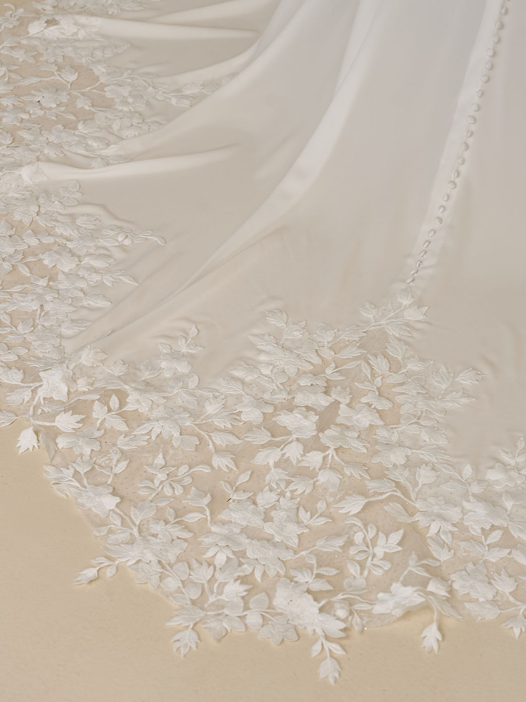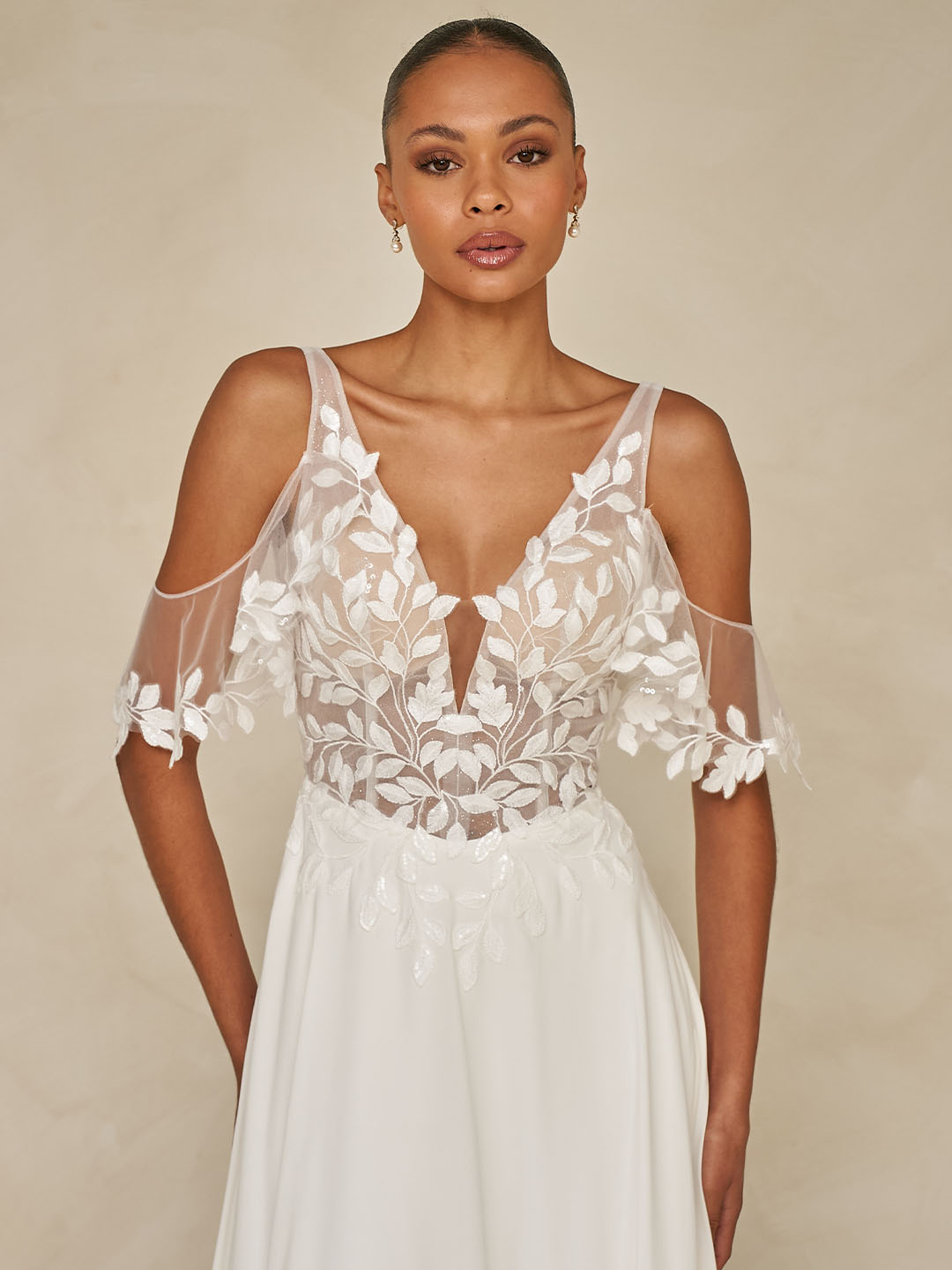 The Lydia wedding gown is a romantic fit-and-flare design available in both all-over lace and a clean crepe variation, offering brides two beautiful interpretations of the same silhouette. The lace version features Chantilly underlace with embroidered sequin and beaded floral motifs, shown in ivory with mocha lining to enhance the detail. The ivory crepe variation offers a smoother, more classic finish with the same thoughtfully placed motifs hand-applied to the bodice. A clean V-neckline with a sheer illusion plunge, delicate side cut-outs, and a deep V back sculpt the figure, while detachable fitted lace sleeves provide elegant coverage and versatility. The soft fit-and-flare skirt finishes with a scalloped illusion lace train, creating a timeless and romantic bridal moment from every angle.