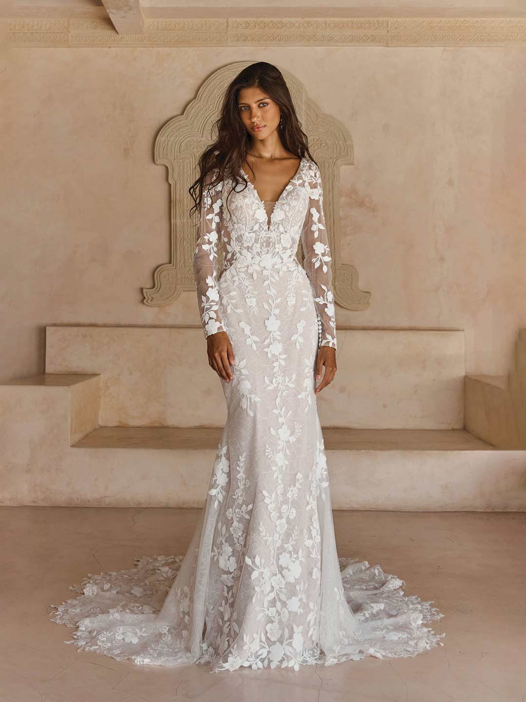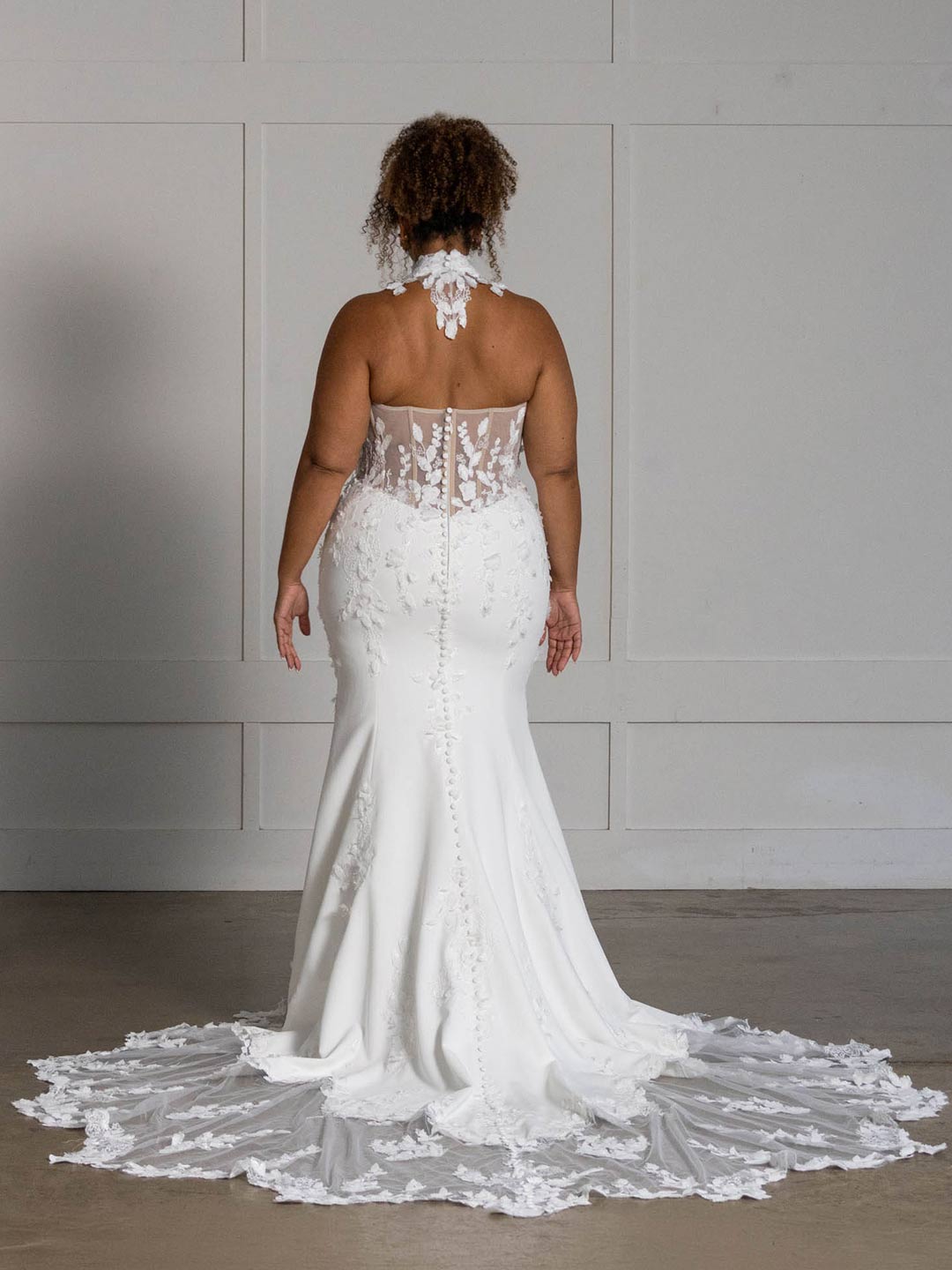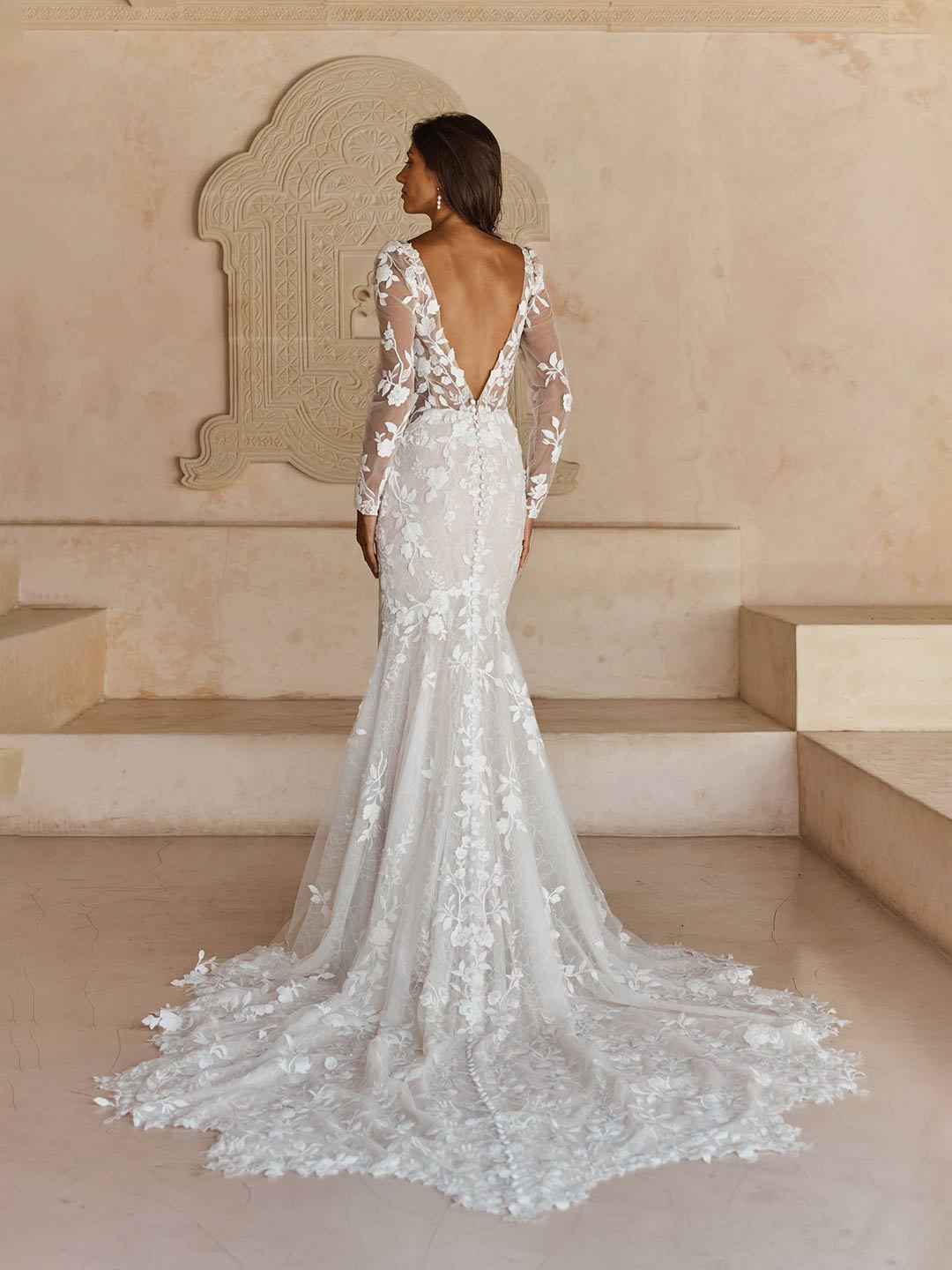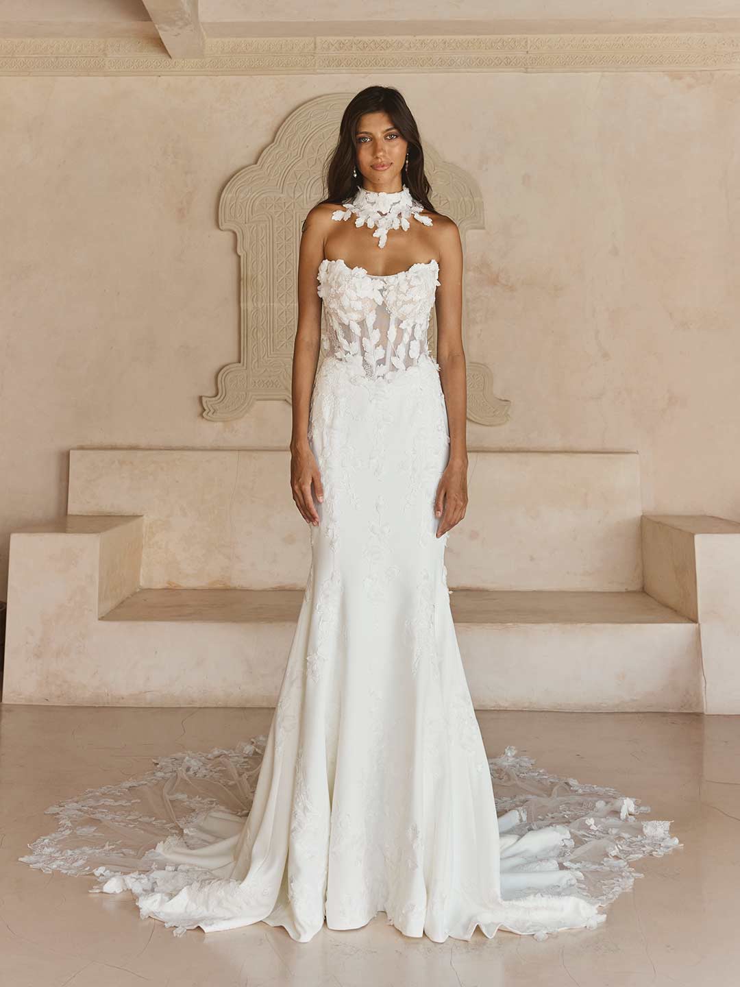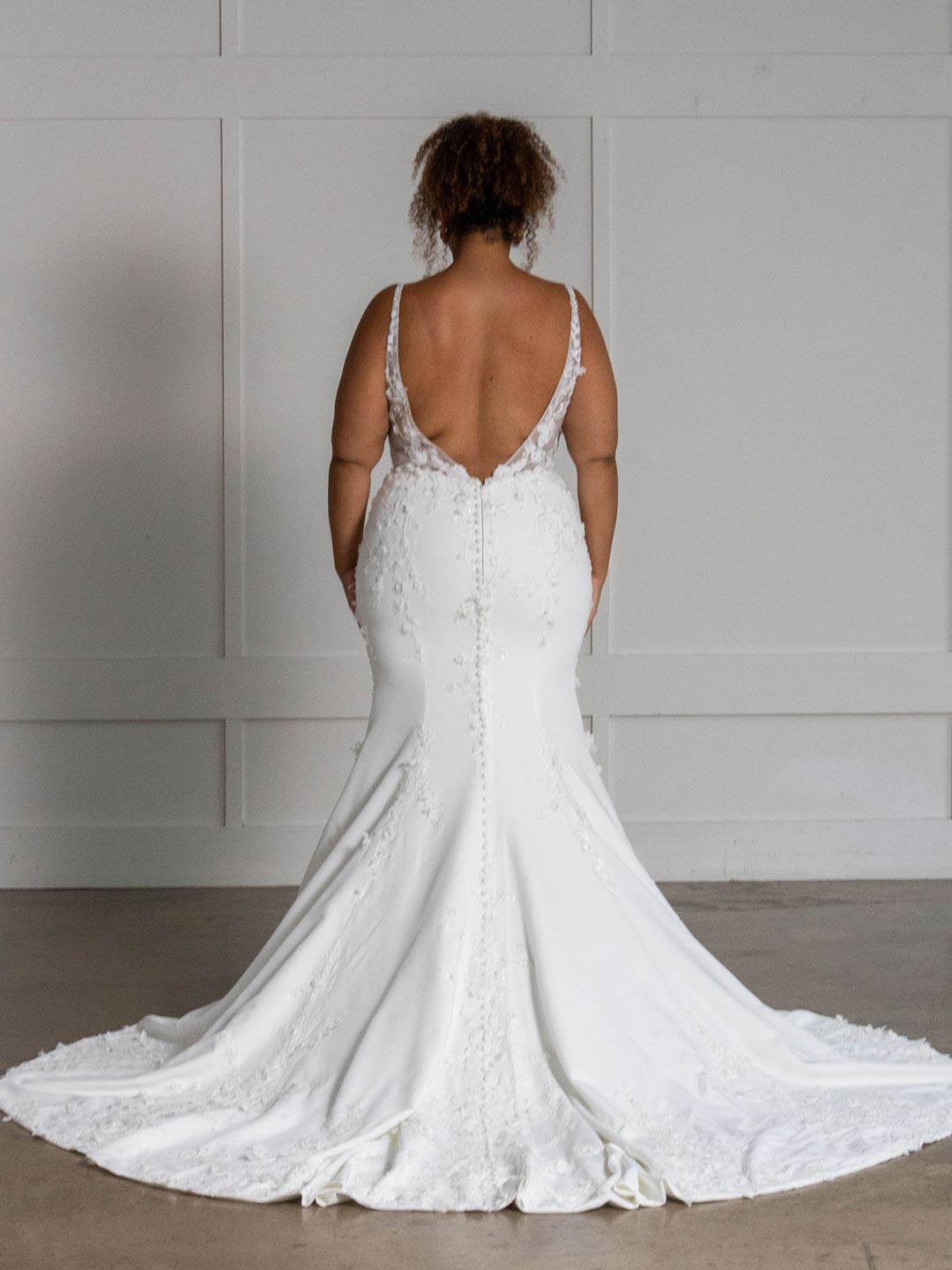 The Lydia wedding gown is a romantic fit-and-flare design available in both all-over lace and a clean crepe variation, offering brides two beautiful interpretations of the same silhouette. The lace version features Chantilly underlace with embroidered sequin and beaded floral motifs, shown in ivory with mocha lining to enhance the detail. The ivory crepe variation offers a smoother, more classic finish with the same thoughtfully placed motifs hand-applied to the bodice. A clean V-neckline with a sheer illusion plunge, delicate side cut-outs, and a deep V back sculpt the figure, while detachable fitted lace sleeves provide elegant coverage and versatility. The soft fit-and-flare skirt finishes with a scalloped illusion lace train, creating a timeless and romantic bridal moment from every angle.