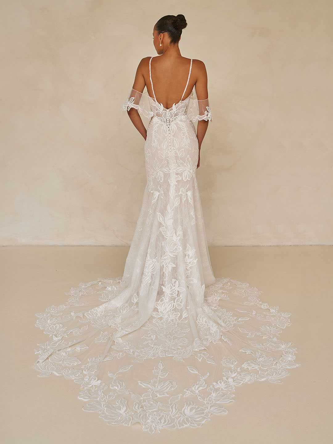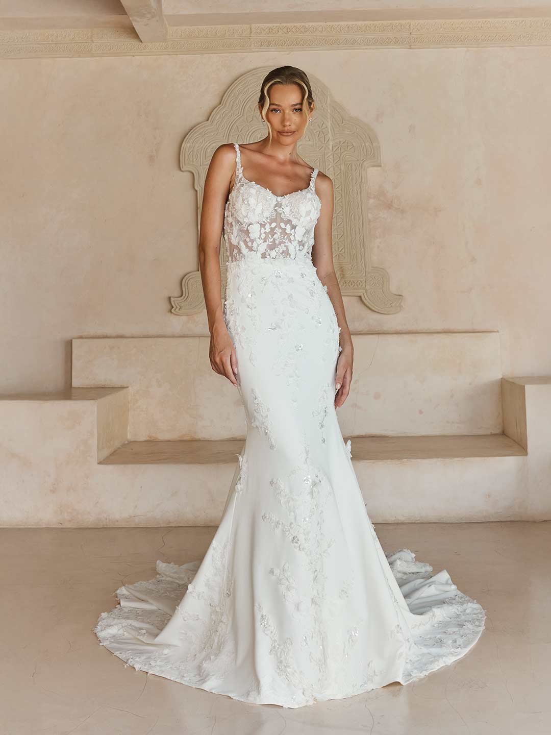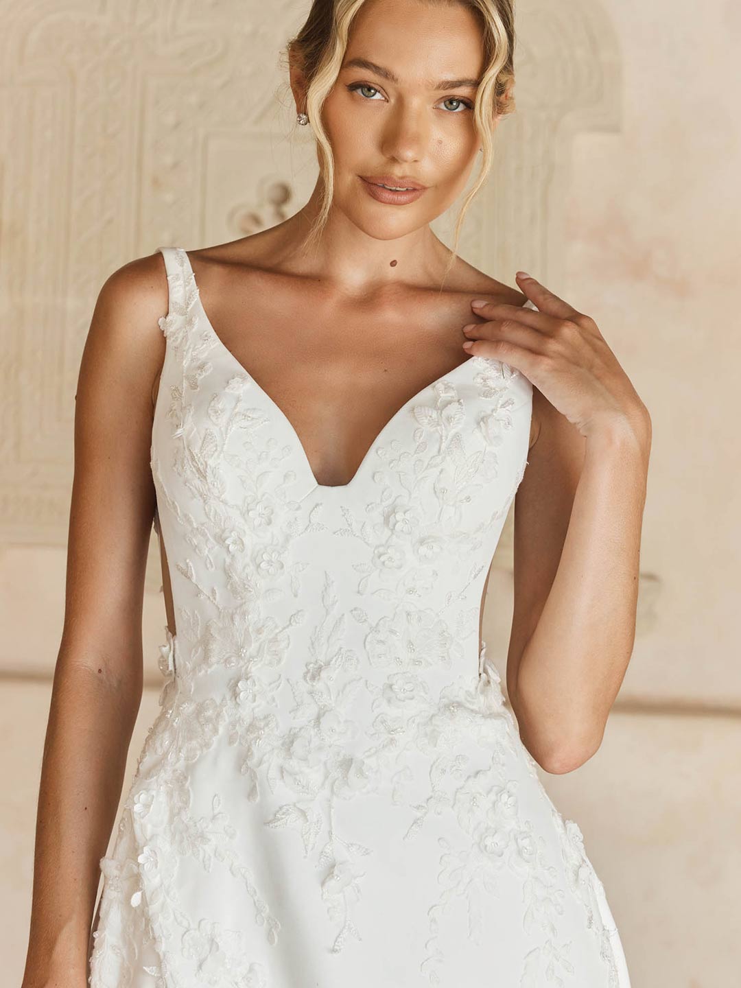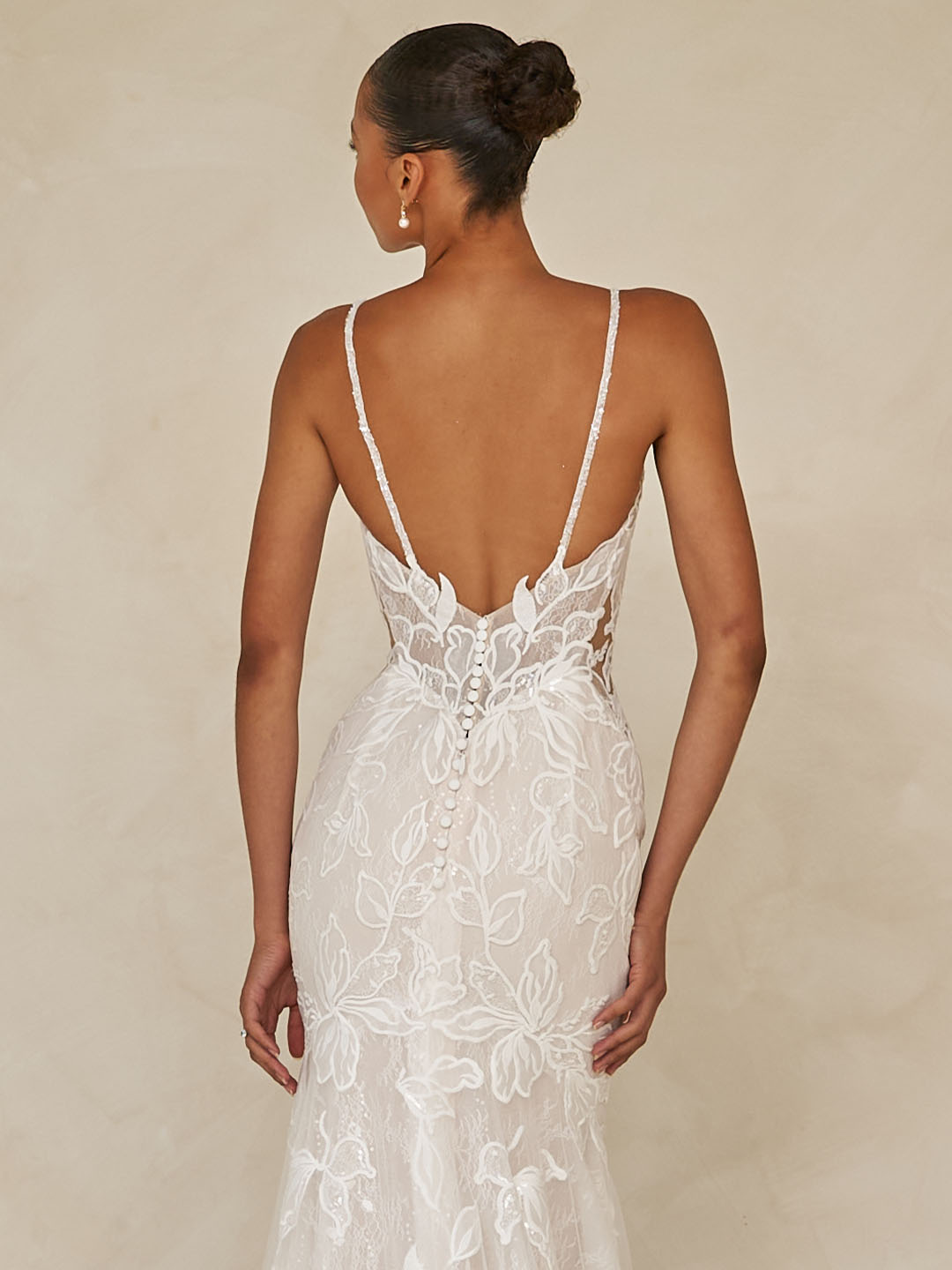 Presenting Samson, the epitome of modern minimalist elegance. As a cornerstone of this season’s ‘Epilogue’ collection, Samson speaks to the contemporary bride who seeks the essence of understated beauty. Her lace illusion bodice, resplendent with intricate floral details, leads to a captivating deep plunge V neckline and delicate thin straps.