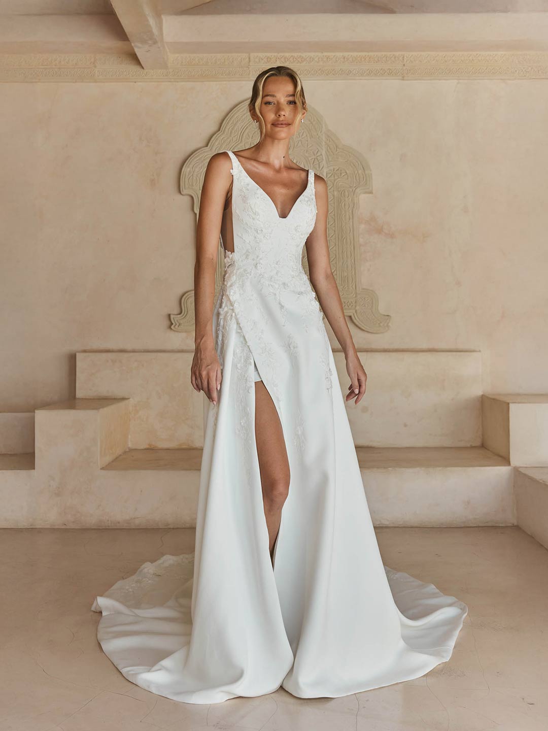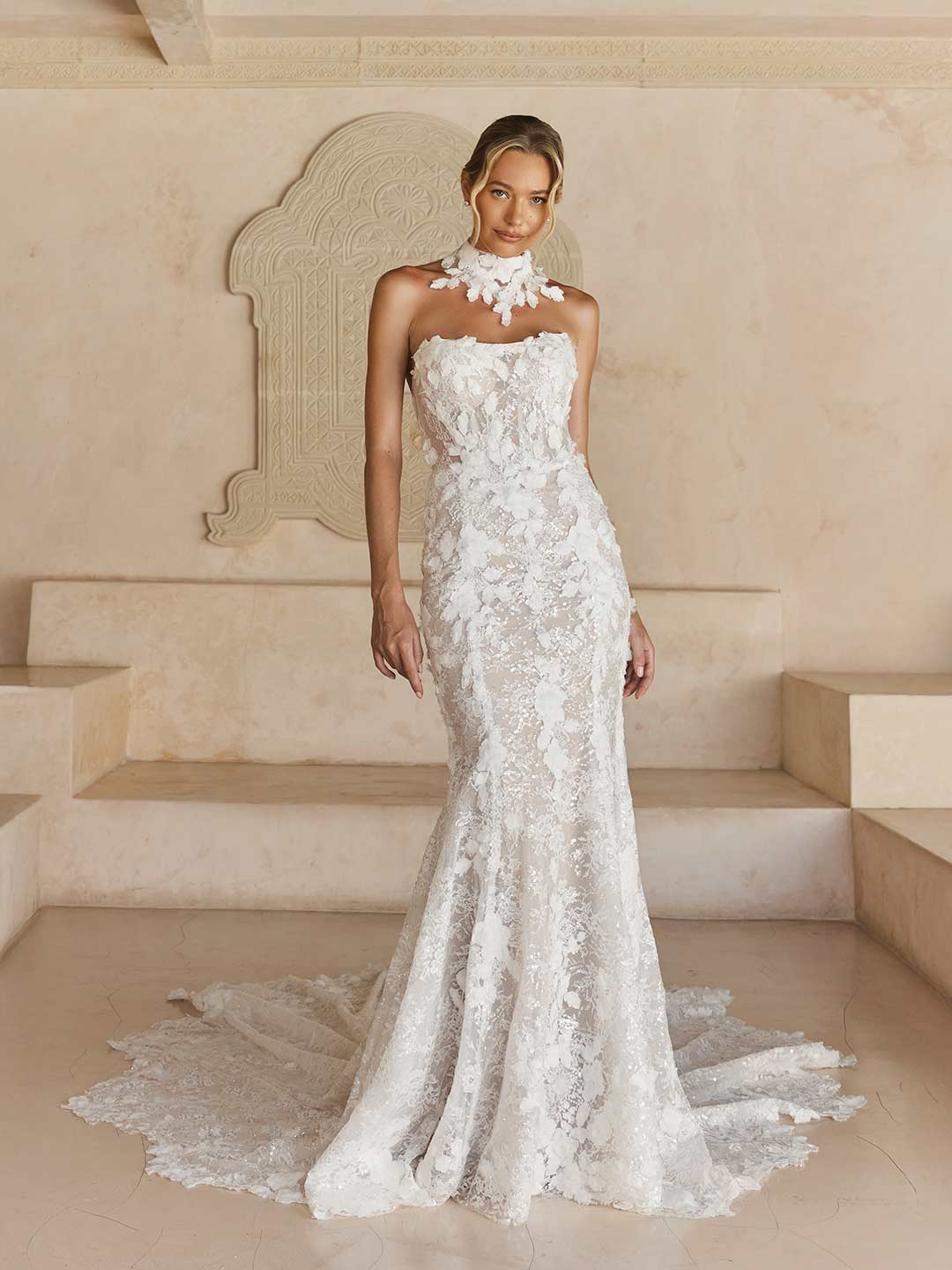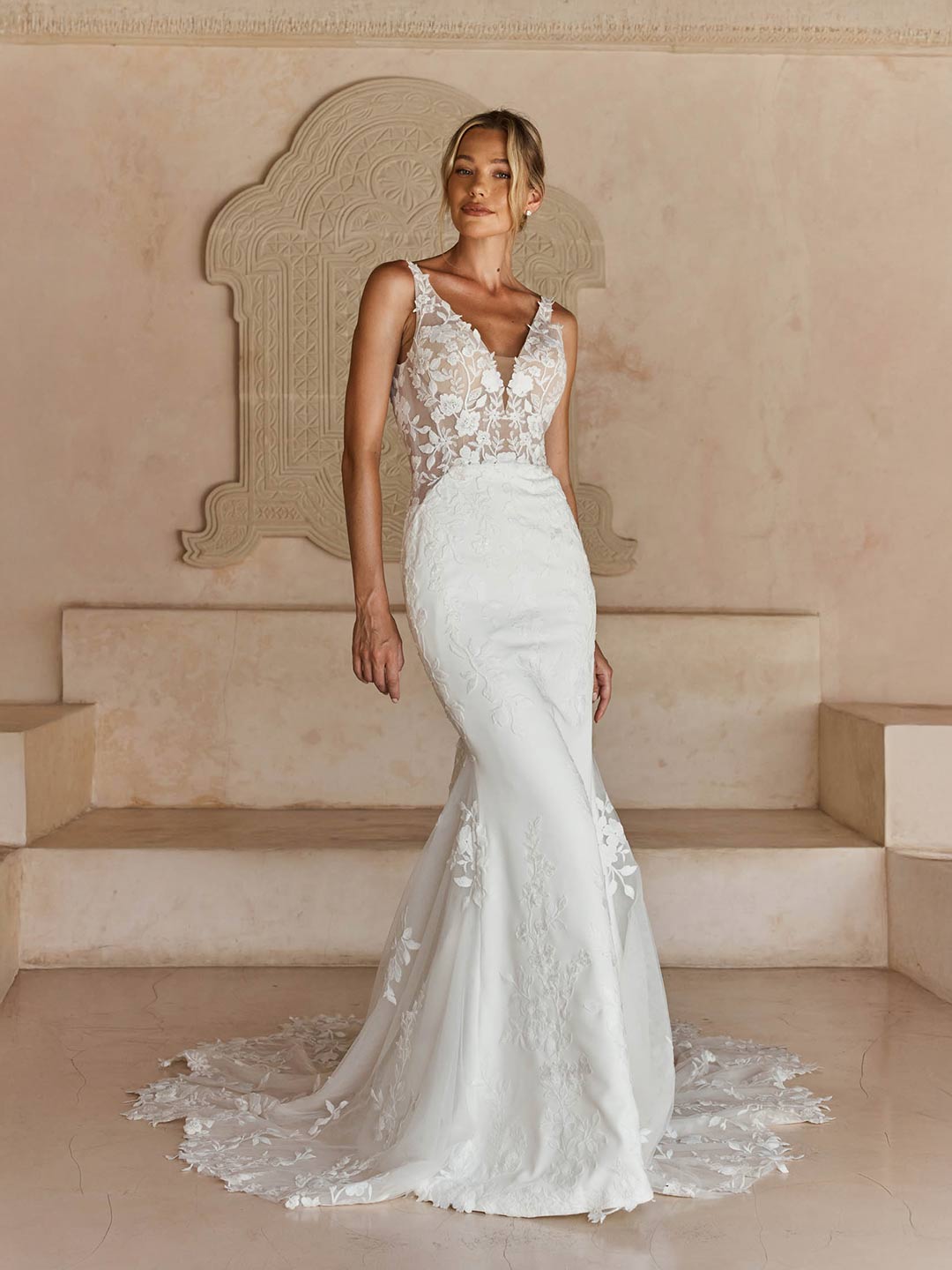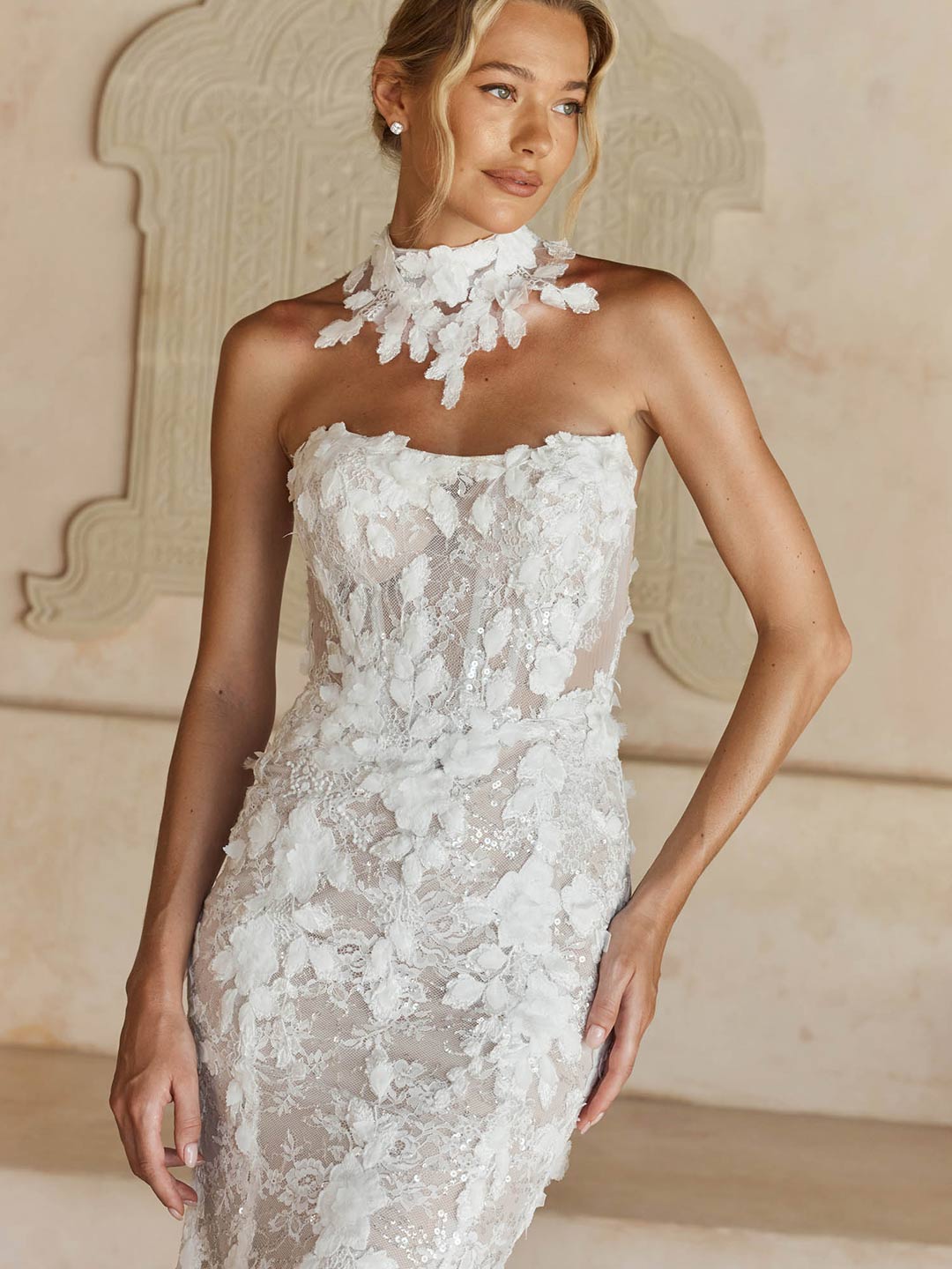 Presenting Samson, the epitome of modern minimalist elegance. As a cornerstone of this season’s ‘Epilogue’ collection, Samson speaks to the contemporary bride who seeks the essence of understated beauty. Her lace illusion bodice, resplendent with intricate floral details, leads to a captivating deep plunge V neckline and delicate thin straps.