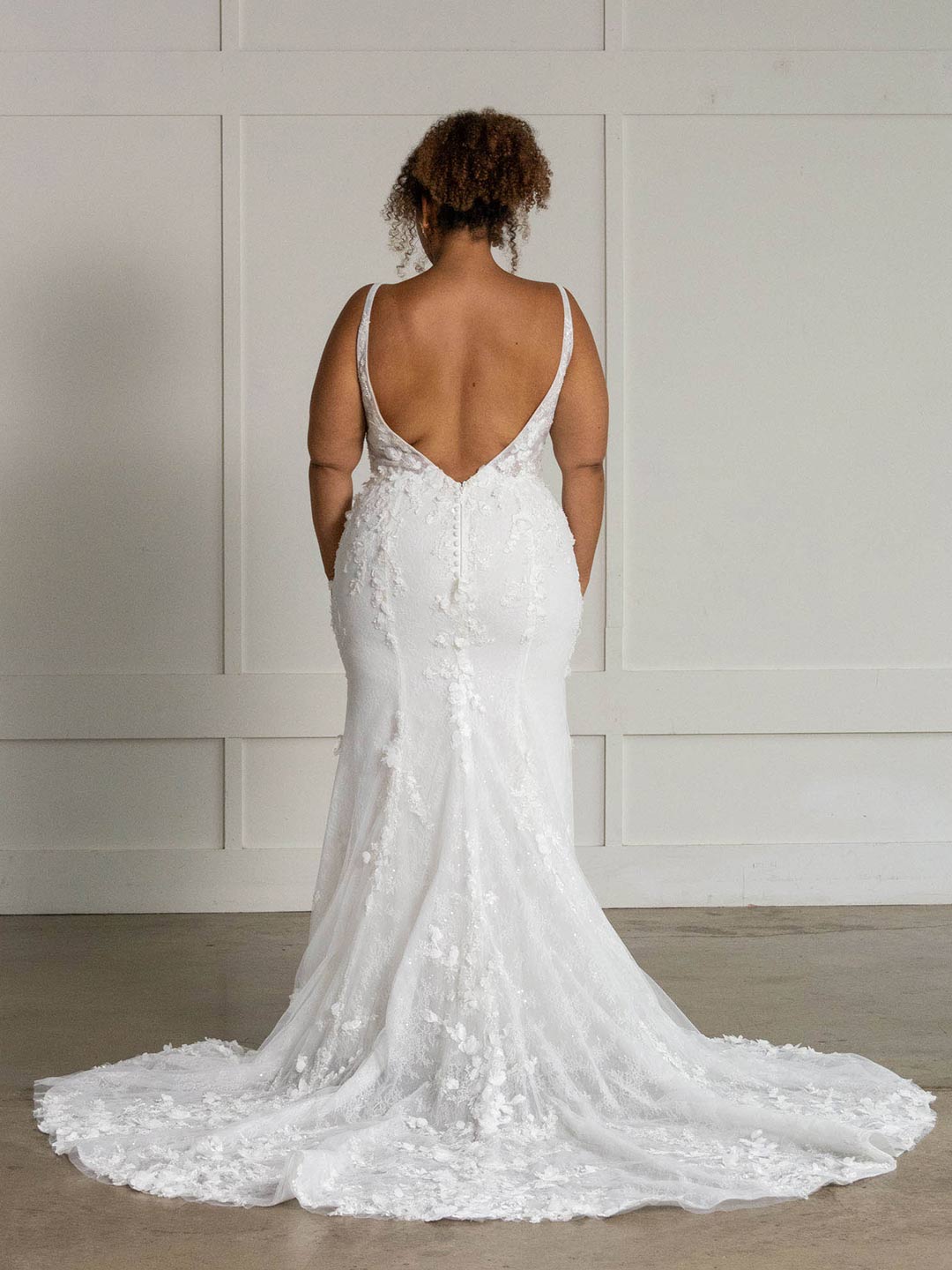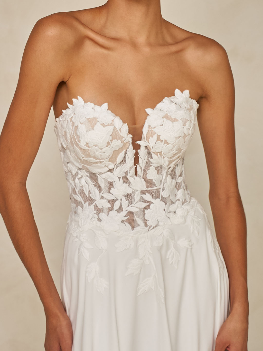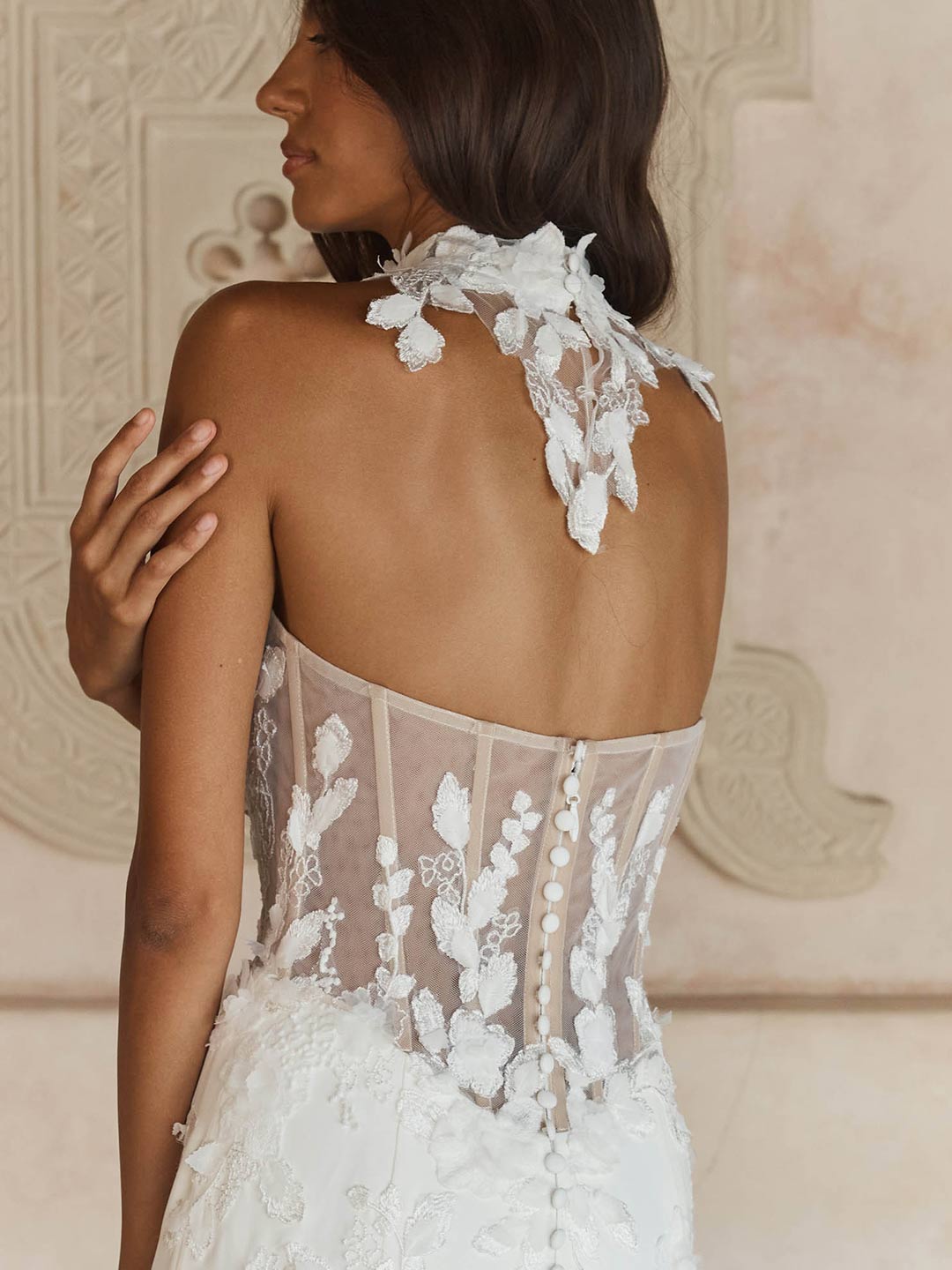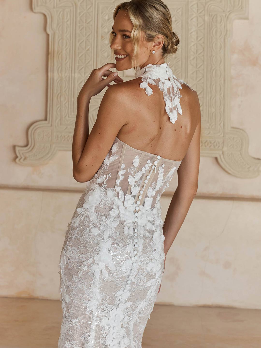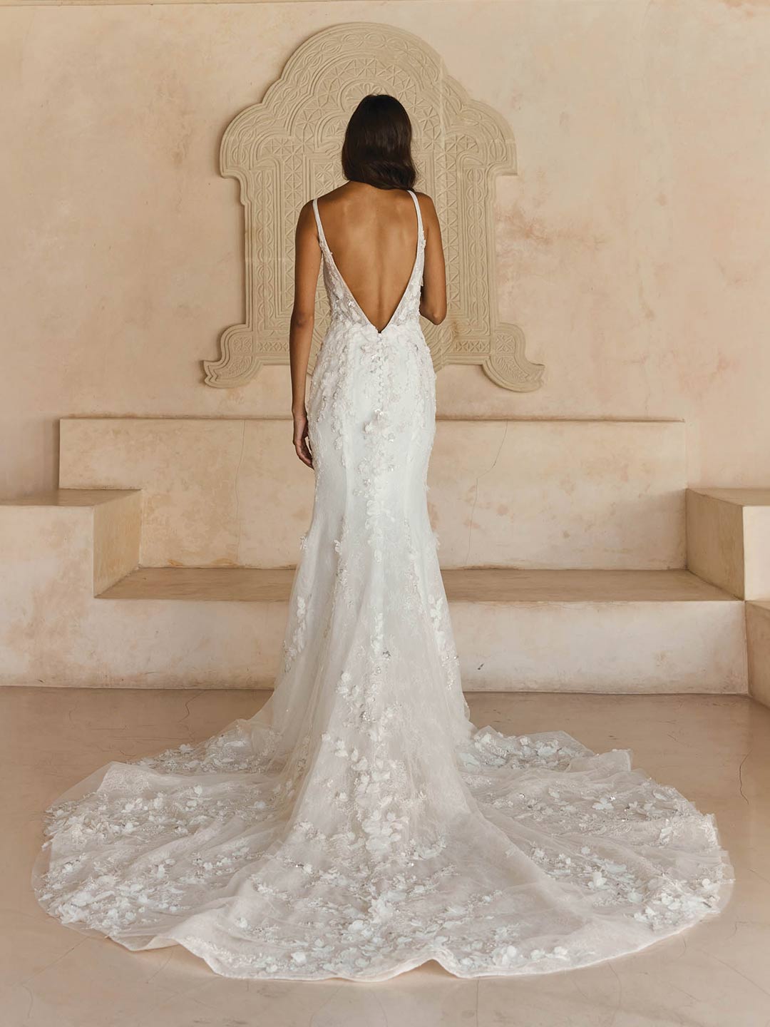 Presenting Samson, the epitome of modern minimalist elegance. As a cornerstone of this season’s ‘Epilogue’ collection, Samson speaks to the contemporary bride who seeks the essence of understated beauty. Her lace illusion bodice, resplendent with intricate floral details, leads to a captivating deep plunge V neckline and delicate thin straps.