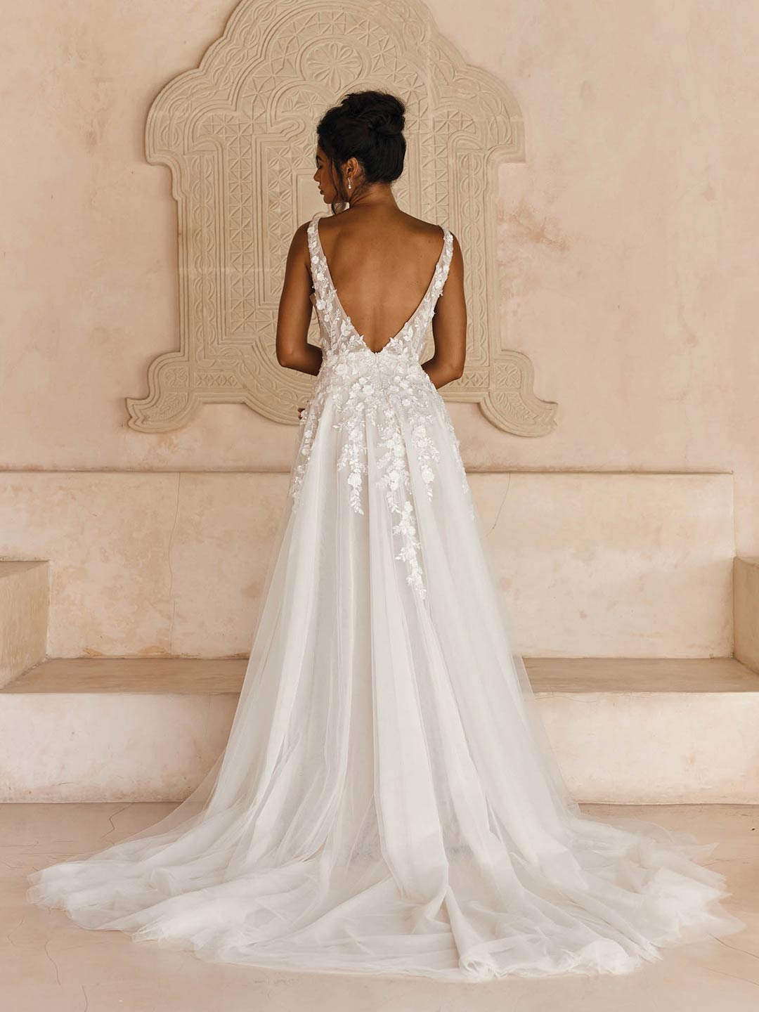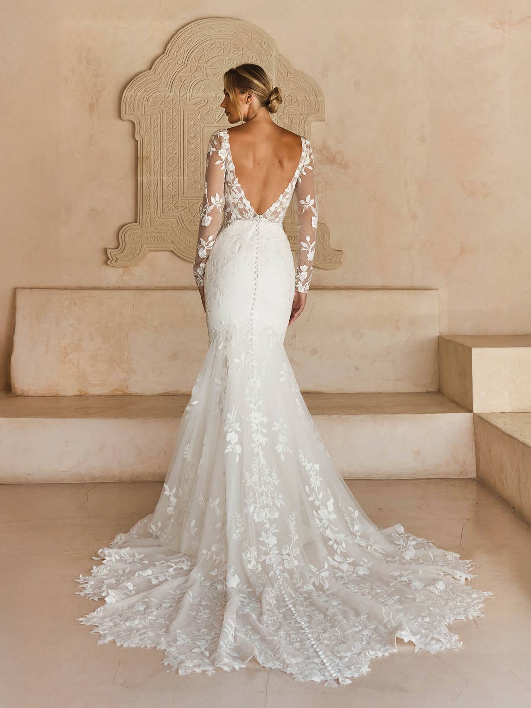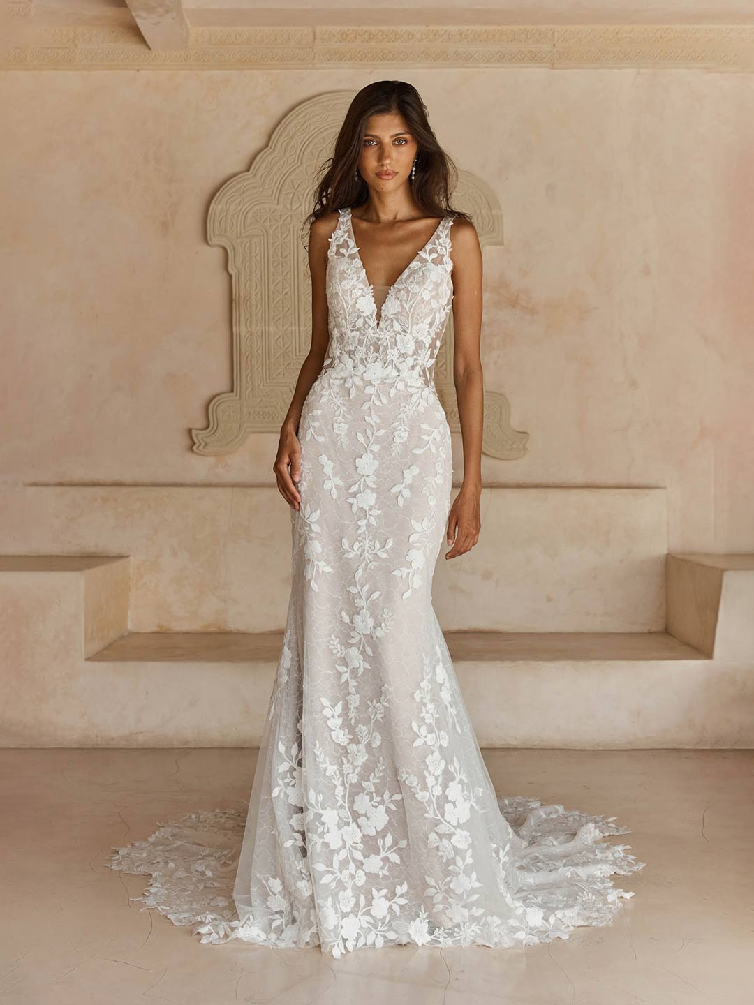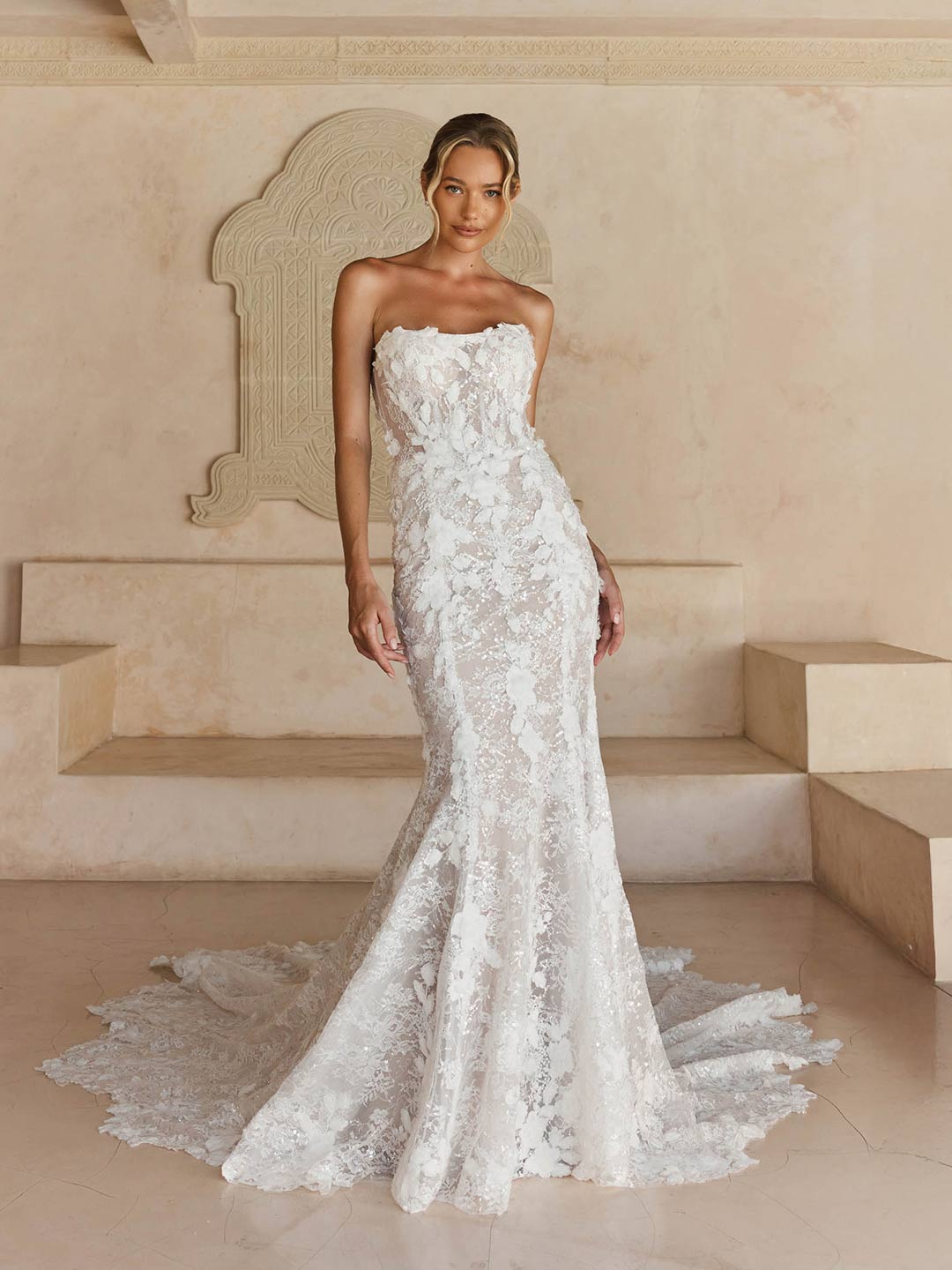 Presenting Samson, the epitome of modern minimalist elegance. As a cornerstone of this season’s ‘Epilogue’ collection, Samson speaks to the contemporary bride who seeks the essence of understated beauty. Her lace illusion bodice, resplendent with intricate floral details, leads to a captivating deep plunge V neckline and delicate thin straps.