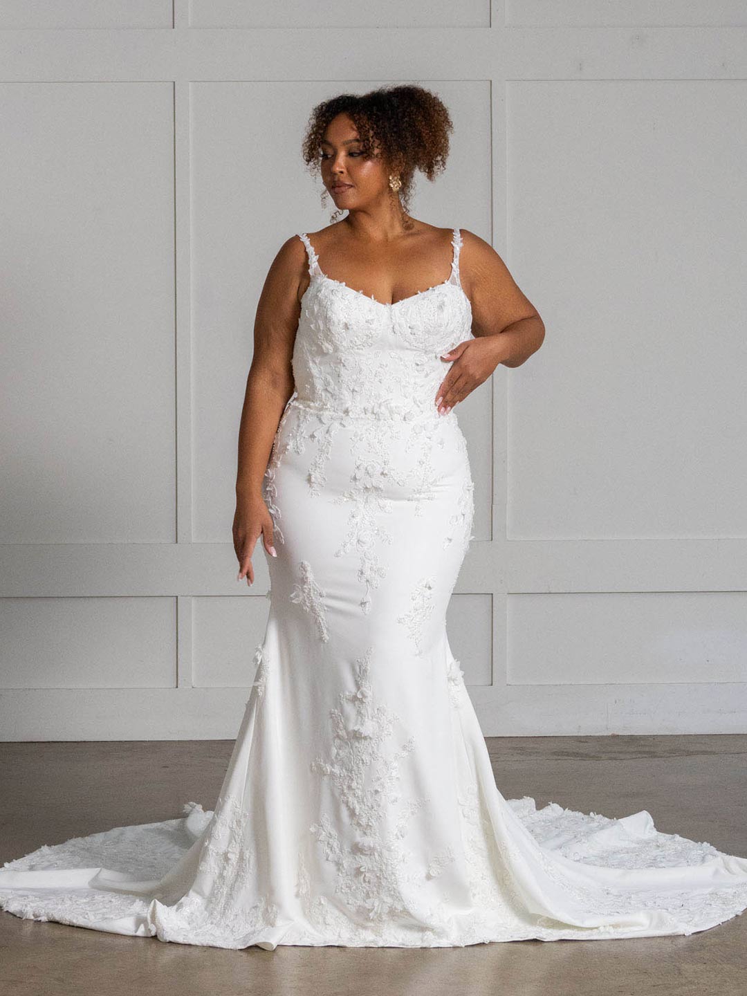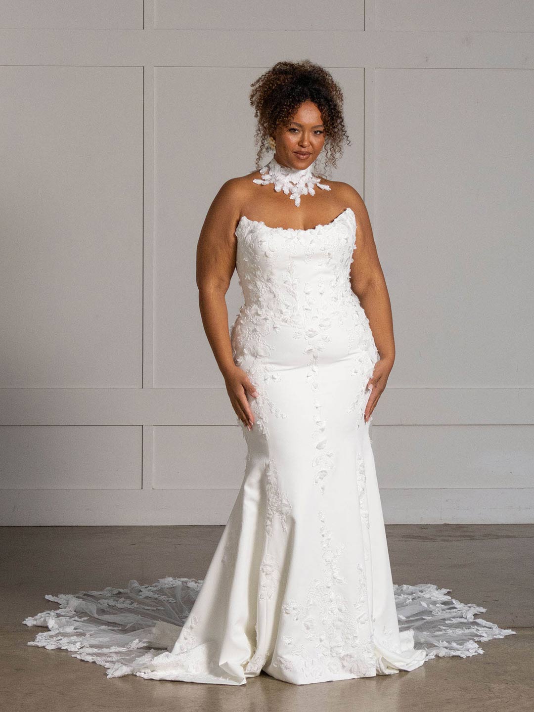 Leith is a chic, figure-hugging wedding dress available in all-over lace or sleek crepe. Designed for brides who want a sculpted, snatched silhouette, Leith features impeccable construction, an internal support band, and contouring seam lines. A modern shallow scoop neckline adds the perfect mix of modest and sexy. The lace version is crafted with glitter Chantilly lace and embroidered 3D motifs for a soft, feminine finish. You can elevate the look with the matching Leith lace collar.