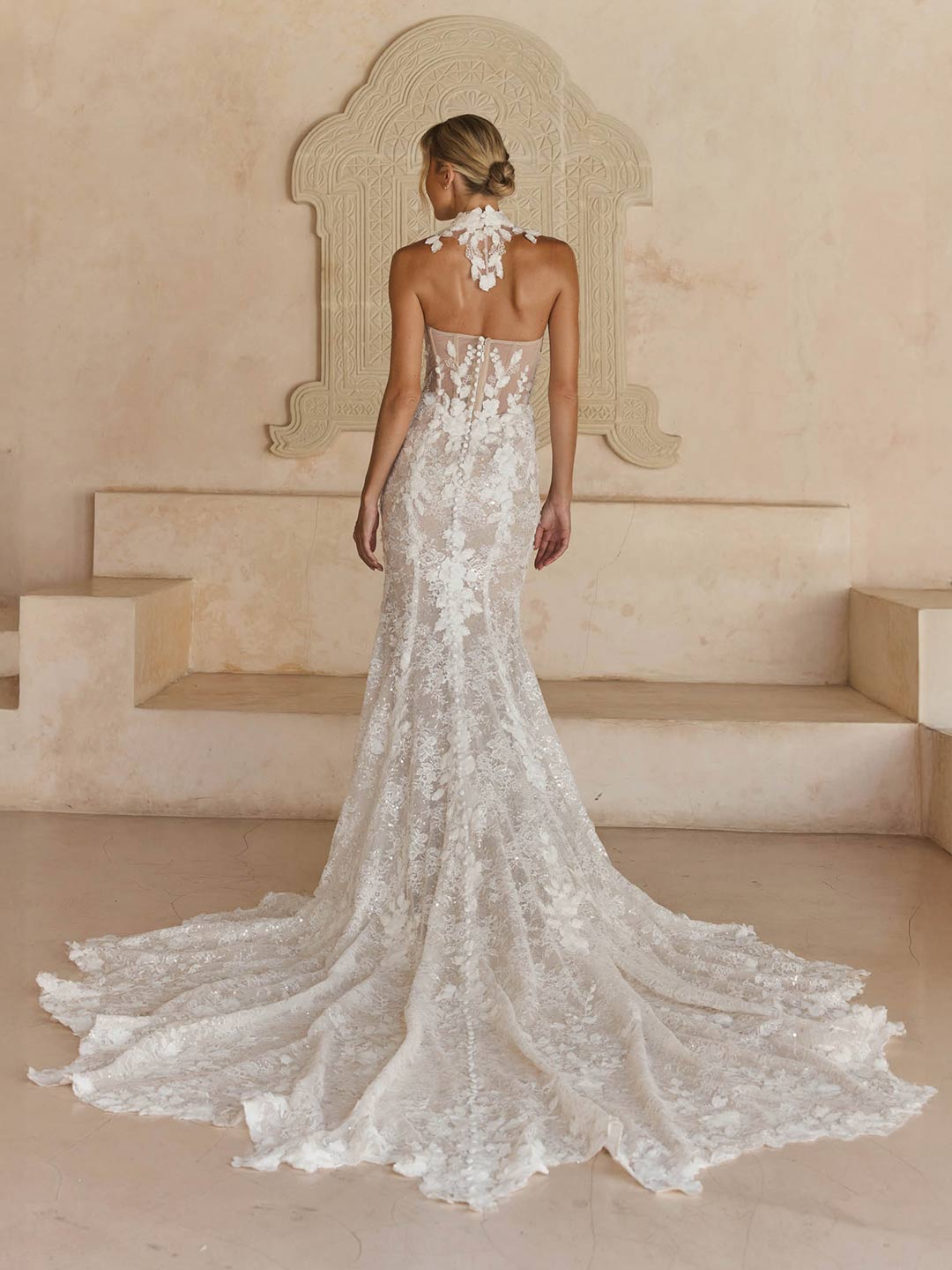 Leni is a soft-glam, sexy fit-and-flare wedding dress available in all-over ivory lace or a sleek ivory crepe variation. A modified sweetheart neckline with supportive straps frames the body beautifully, leading to a striking low V-back. The sheer illusion bodice features sequin Chantilly underlace with hand-embroidered 3D motifs for dimensional texture. Thoughtful lace placement contours the figure from bodice to skirt, finishing with delicate 3D details and a full illusion lace train.Leni can also be ordered with a more modest back, and pairs perfectly with a matching veil.