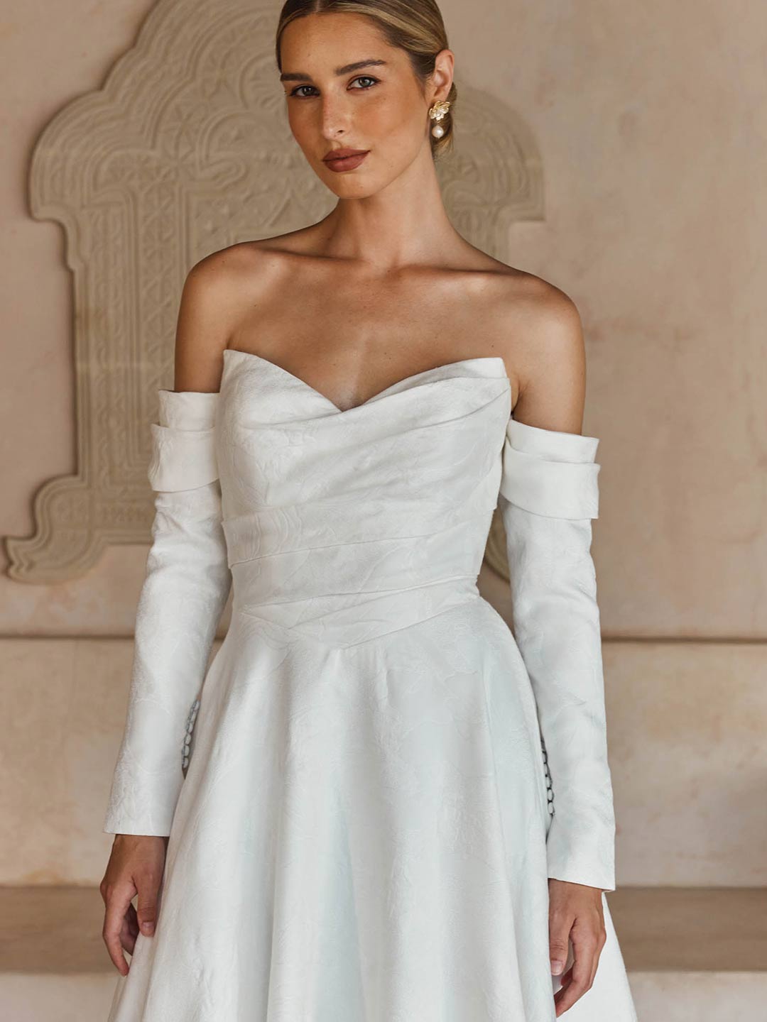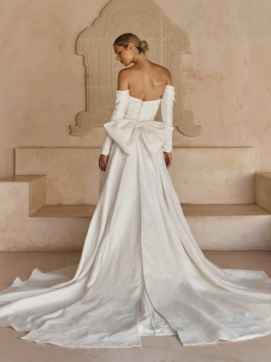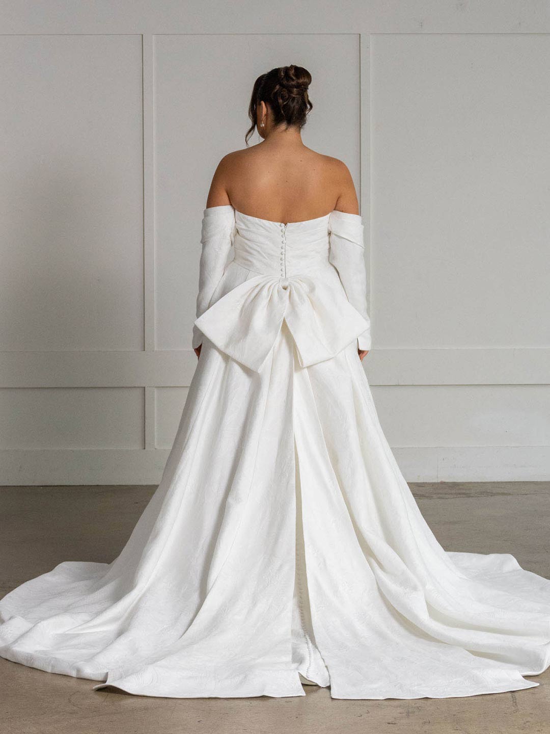 Liam is a striking ivory brocade A-line wedding dress with a clean, modern feel and subtle renaissance influence. Available in brocade or lighter satin, the look can be styled with detachable long sleeves or an optional oversized bow. The peaked strapless neckline and pleated, boned bodice create a flattering, snatched Basque waist. The soft A-line skirt balances the detailed brocade, while the high back and fabric-covered buttons offer elegant support for all sizes.