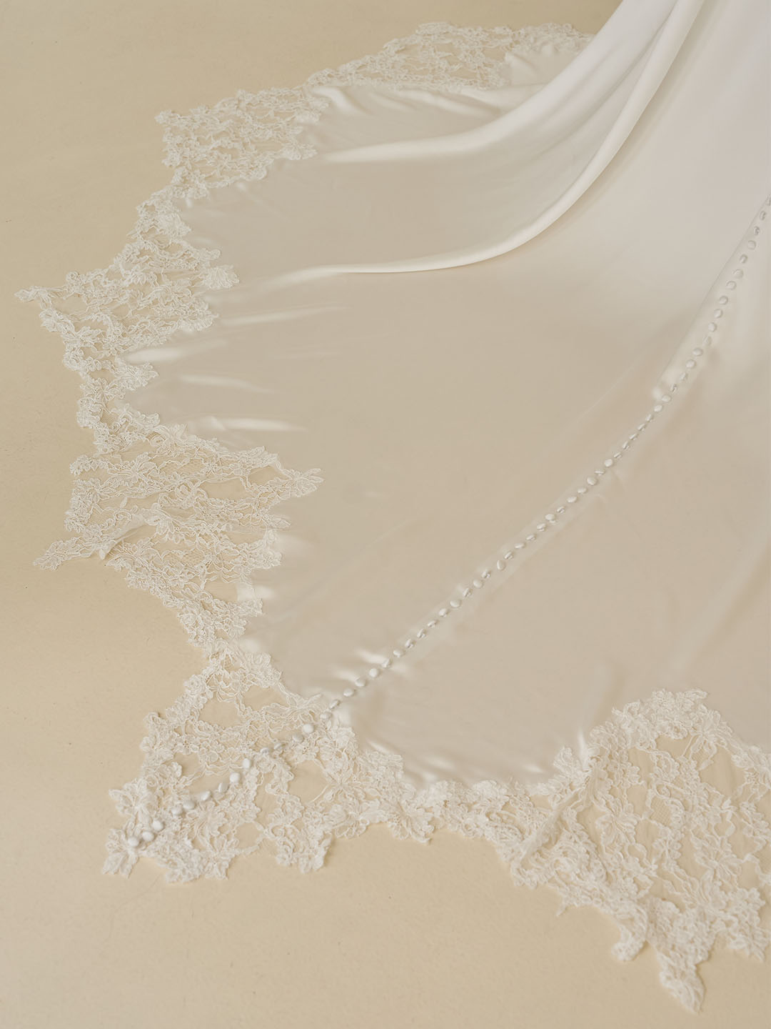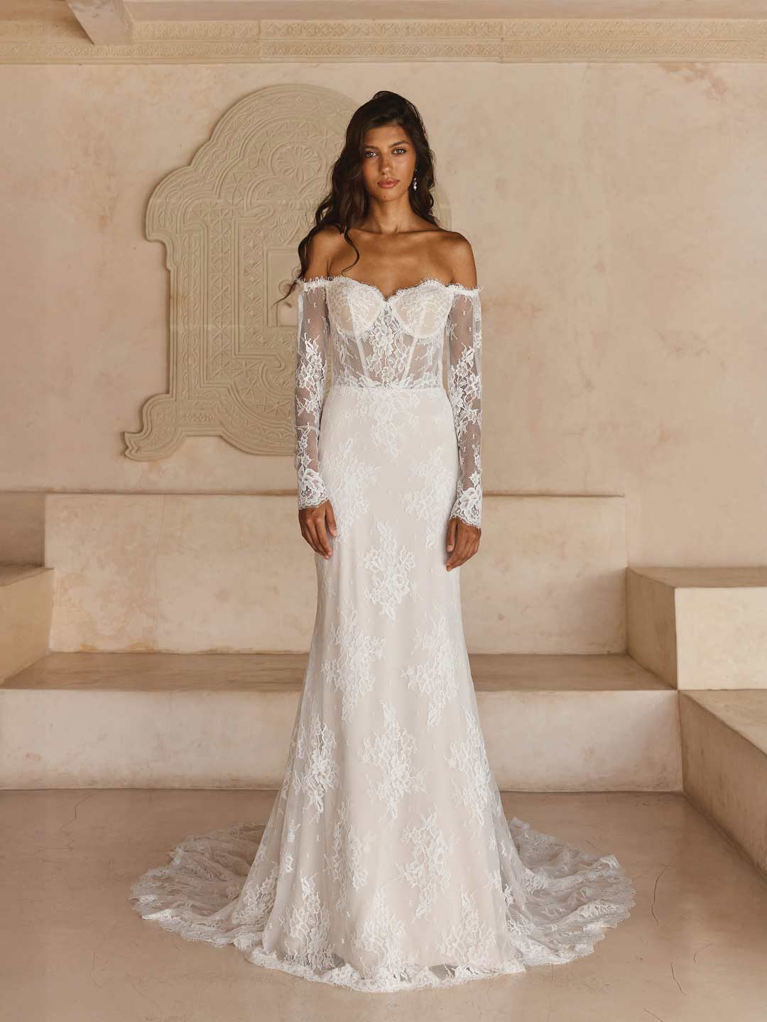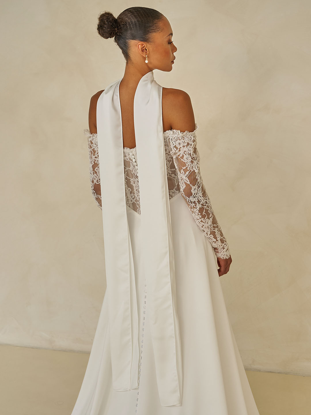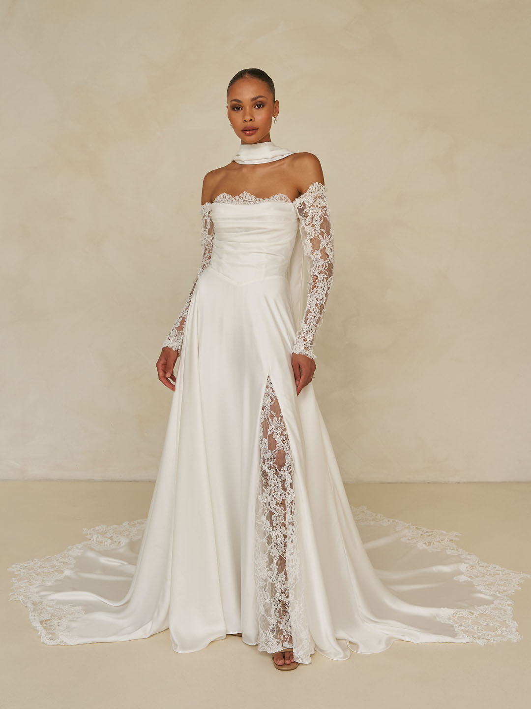 Effortlessly chic and endlessly romantic, the Ward wedding gown combines sleek minimalism with couture detail. Its slinky, flowy satin skirt features a thigh-high slit and a whisper of Chantilly lace. With long lace sleeves, a modern square off-the-shoulder neckline, and a softly draped bodice edged in lace, it’s complemented by a refined Basque waistline and coordinating satin neck scarf. The Ward gown perfectly balances clean lines and romantic texture, a modern interpretation of timeless bridal elegance.