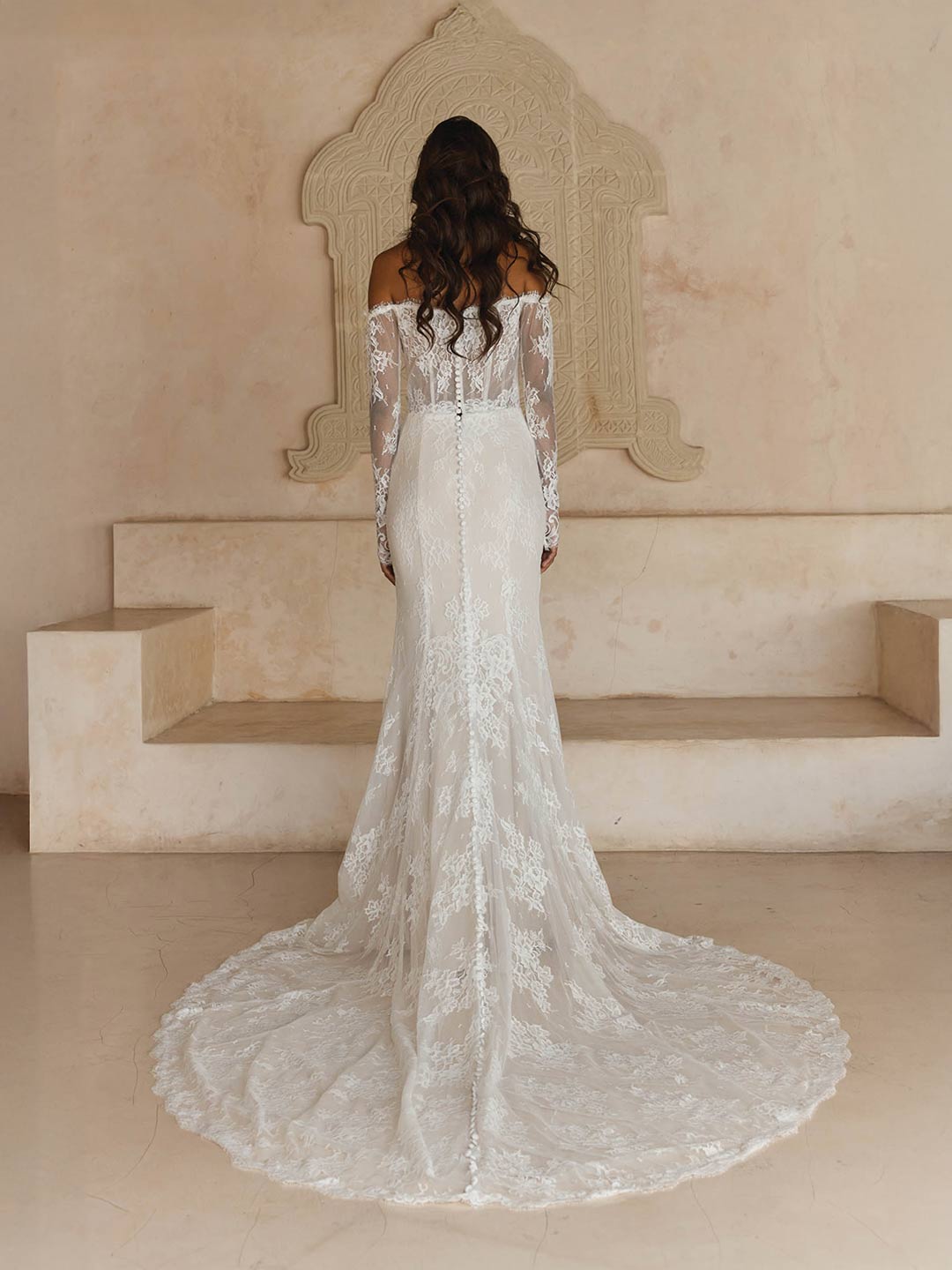 The Lilly wedding gown is a romantic fit-and-flare silhouette crafted entirely from soft Chantilly lace, blending timeless femininity with modern allure. Her sweetheart neckline and delicate eyelash-lace long sleeves frame the shoulders beautifully, while the bodice in the boutique is the lined version for added coverage and support. (Model images show the unlined option.) A simple waistline leads into a soft mermaid-style skirt with a scalloped Chantilly lace hem and an illusion lace train, finished with centre-back buttons for a classic, refined bridal look.