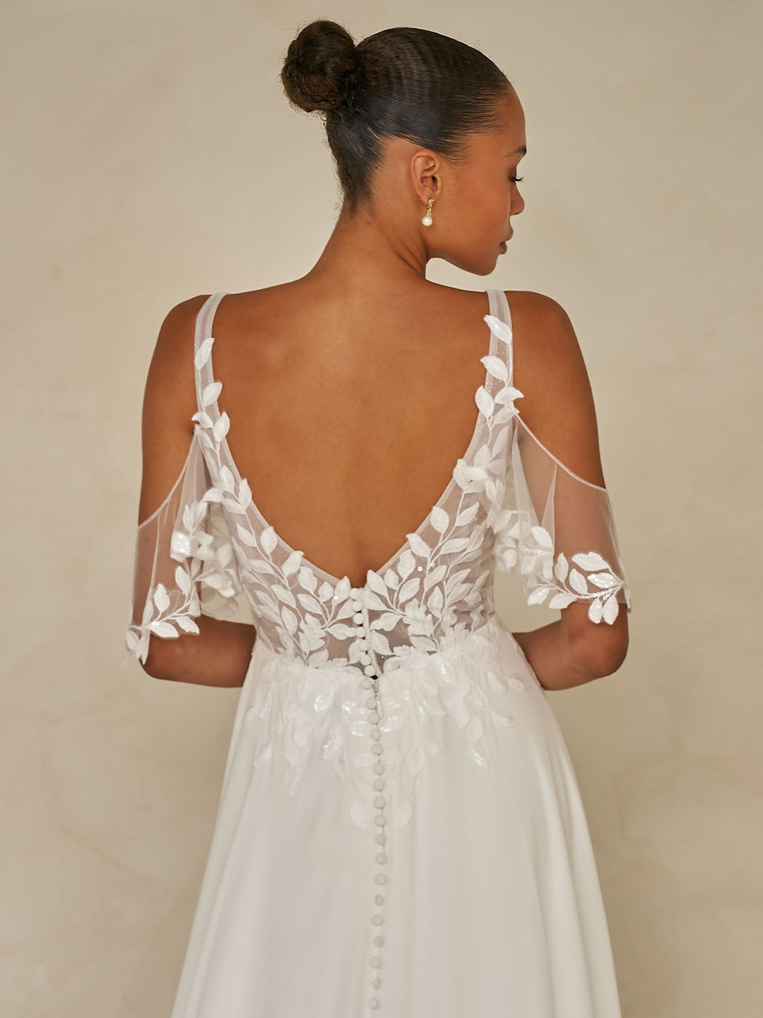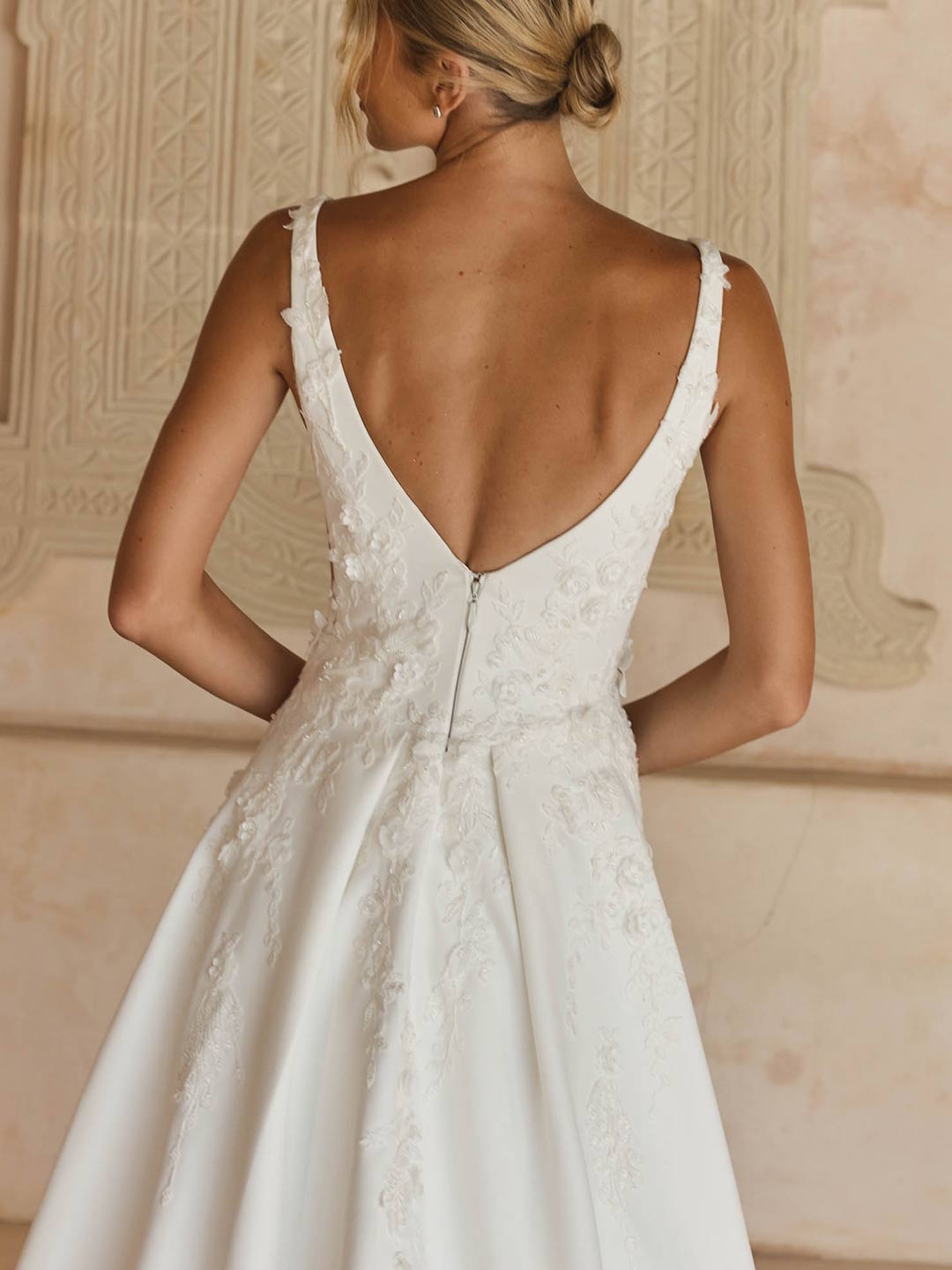 Lindy is a sleek, understated A-line wedding dress in luxe Suede Satin, perfect for a modern minimalist look. A V-neckline and shaped waistband create a flattering silhouette, enhanced by sheer side panels. Embroidered sequin 3D motifs trail from the bodice into the wrap-style A-line skirt before fading into a clean, lightweight hem. At the back, a mid-height bodice and satin-covered buttons running to the hem add an elegant, dramatic finish.