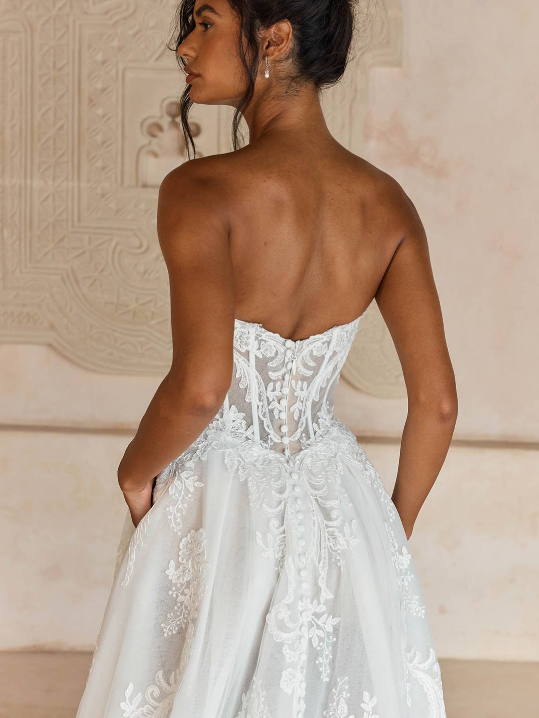 Luisa is an ethereal A-line gown in soft ivory organza, designed with a modern sheer look and optional lining for different bridal styles. She features a contemporary sweetheart neckline, illusion bodice and exposed corset-style boning, with bold embroidered sequin motifs that flatter the figure. A dipped waistline meets a light, A-line skirt with glitter tulle, a right leg split (optional), and side pockets. The high back bodice offers great support, while centre-back buttons trail down to the finished lace hem.