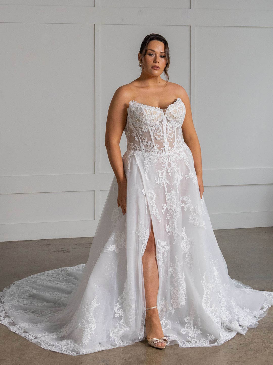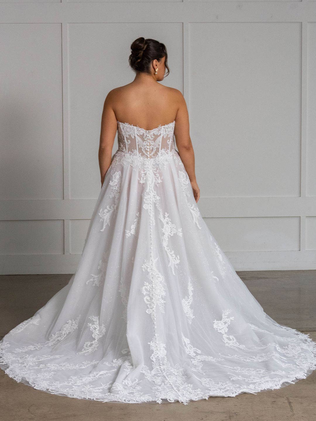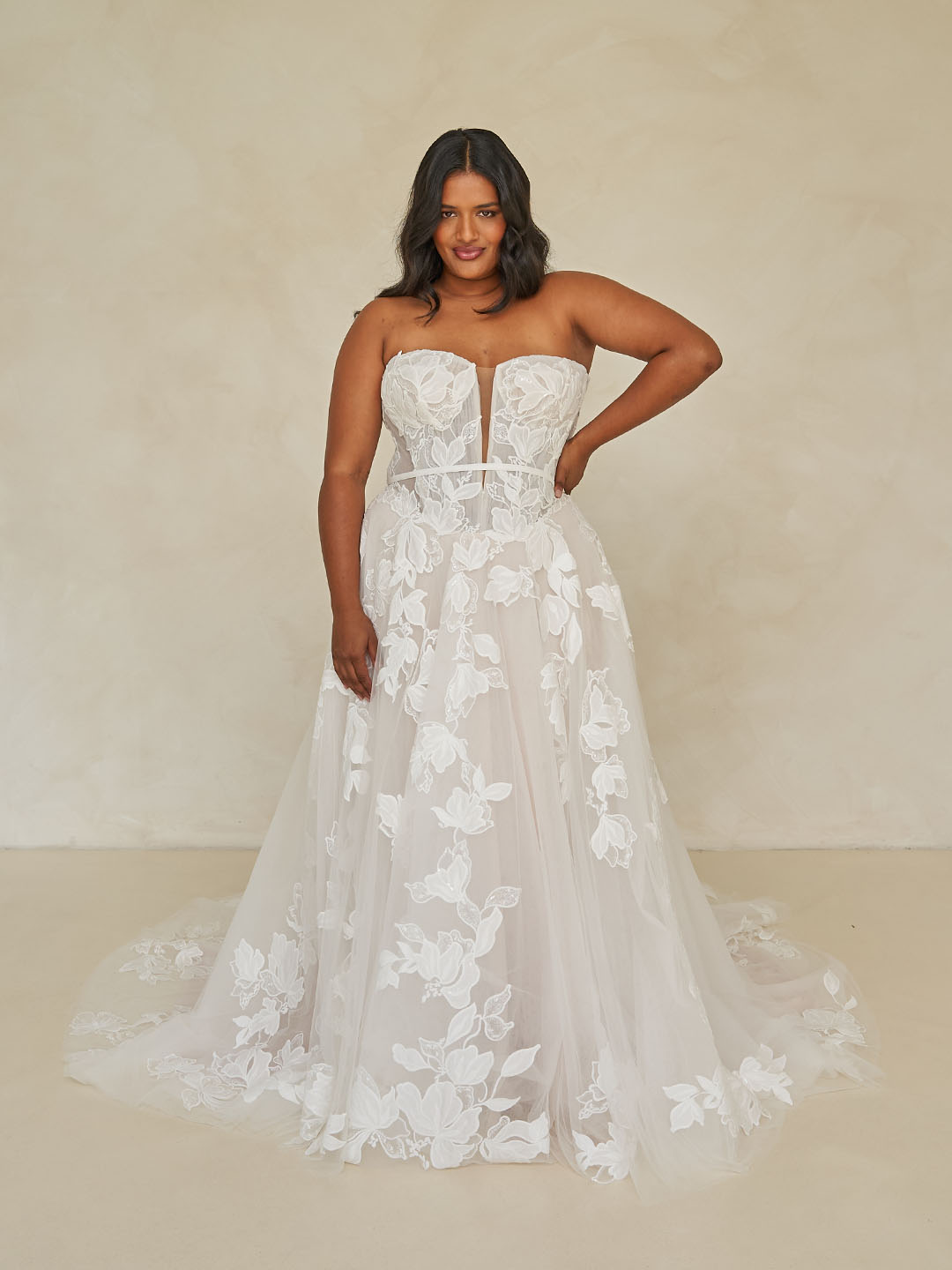 Striking and bold florals are the focal point on the Kyann gown. Her floral sheet lace cascades the length of the gown and the glitter tulle shimmers in the light. Her sweetheart neckline, illusion bodice and buttoned back bodice are hints of subtle elegance. The simple strapless A-line silhouette complements the extravagance created by the all-over floral and sequin detail.