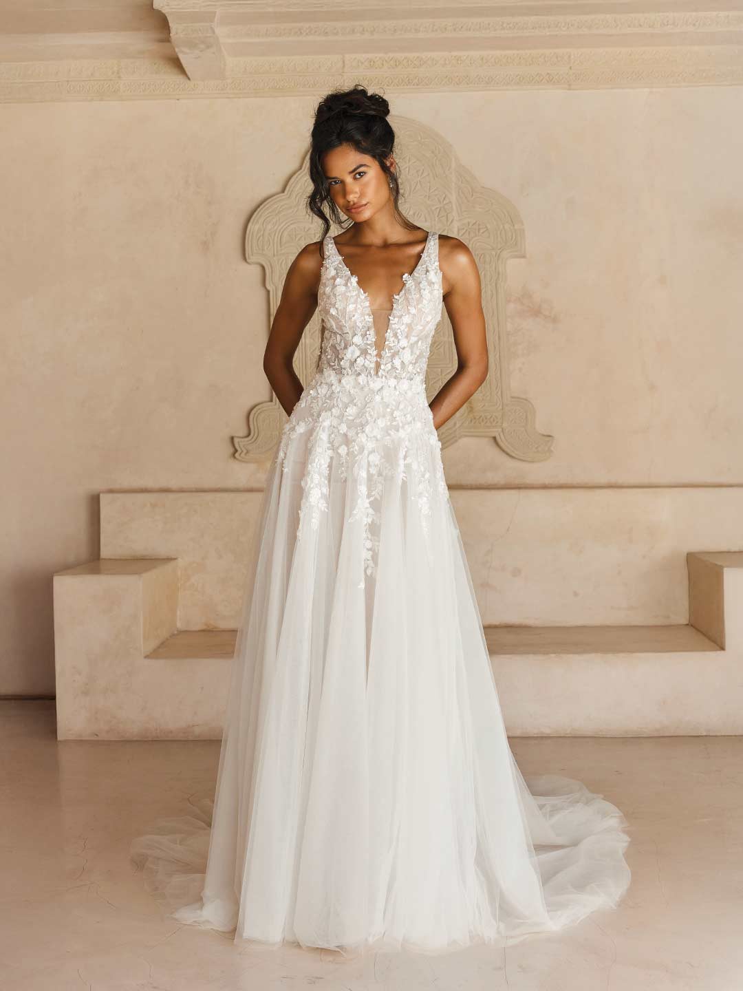 Lyndall is a modern lace A-line wedding dress with a sexy plunging illusion V-neckline and deep V-back. Supportive shoulder straps keep the look comfortable, while the sheer bodice features glitter tulle and hand-beaded embroidery for soft glam. Sheer side panels and a subtle drop waist highlight the figure, with beaded motifs drifting into the light tulle A-line skirt for an effortless, romantic finish.