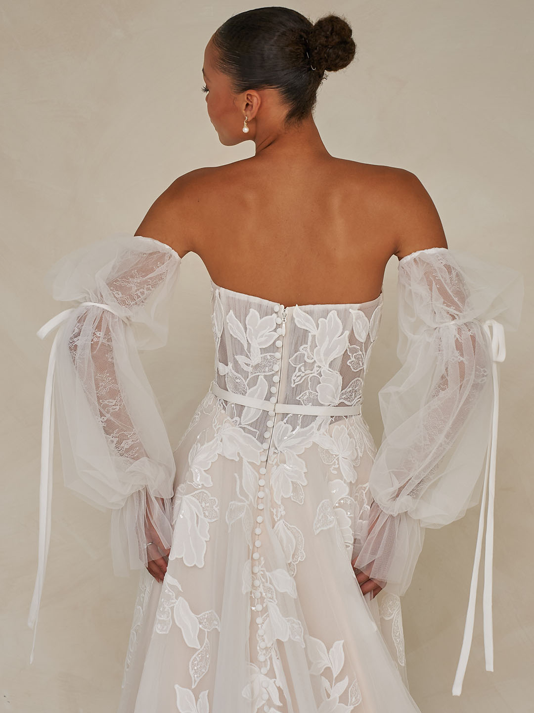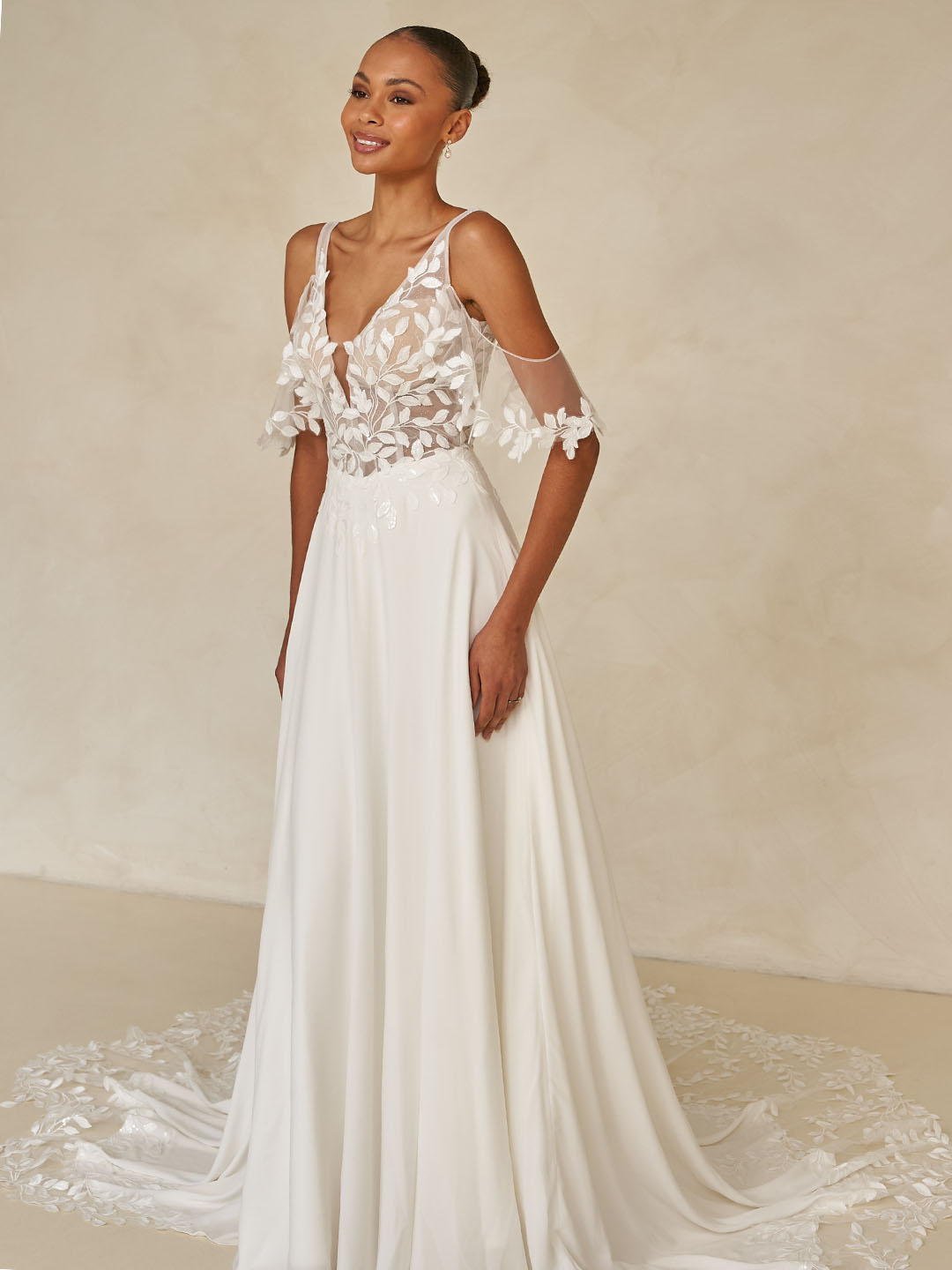 The Wynne wedding gown embodies understated romance and modern refinement.Crafted in airy chiffon with delicate lace detailing, it features a structured bodice with refined boning, a flattering Basque waistline, and an illusion back flowing into a lace-trimmed chiffon train. Detachable off-shoulder sleeves and a matching scarf complete this timeless, graceful silhouette for the contemporary bride.